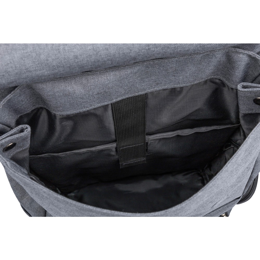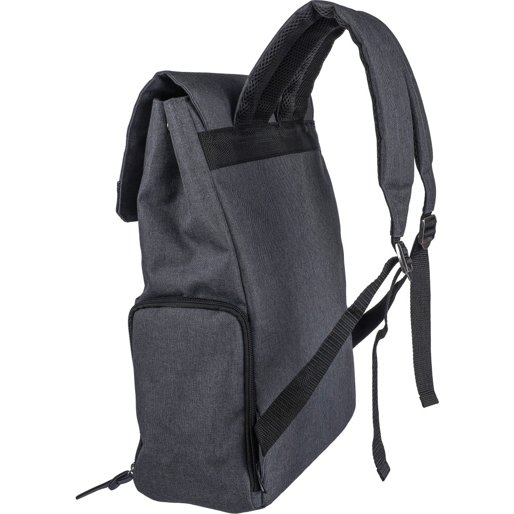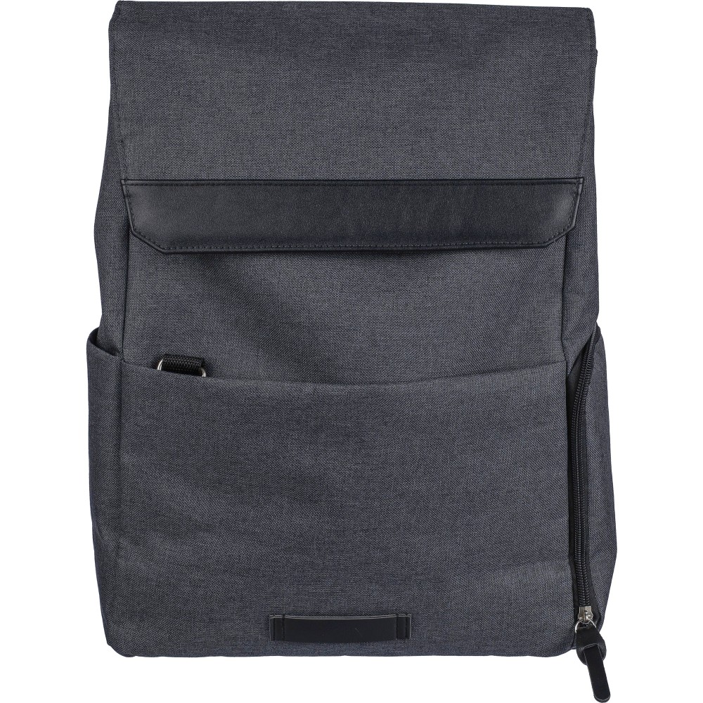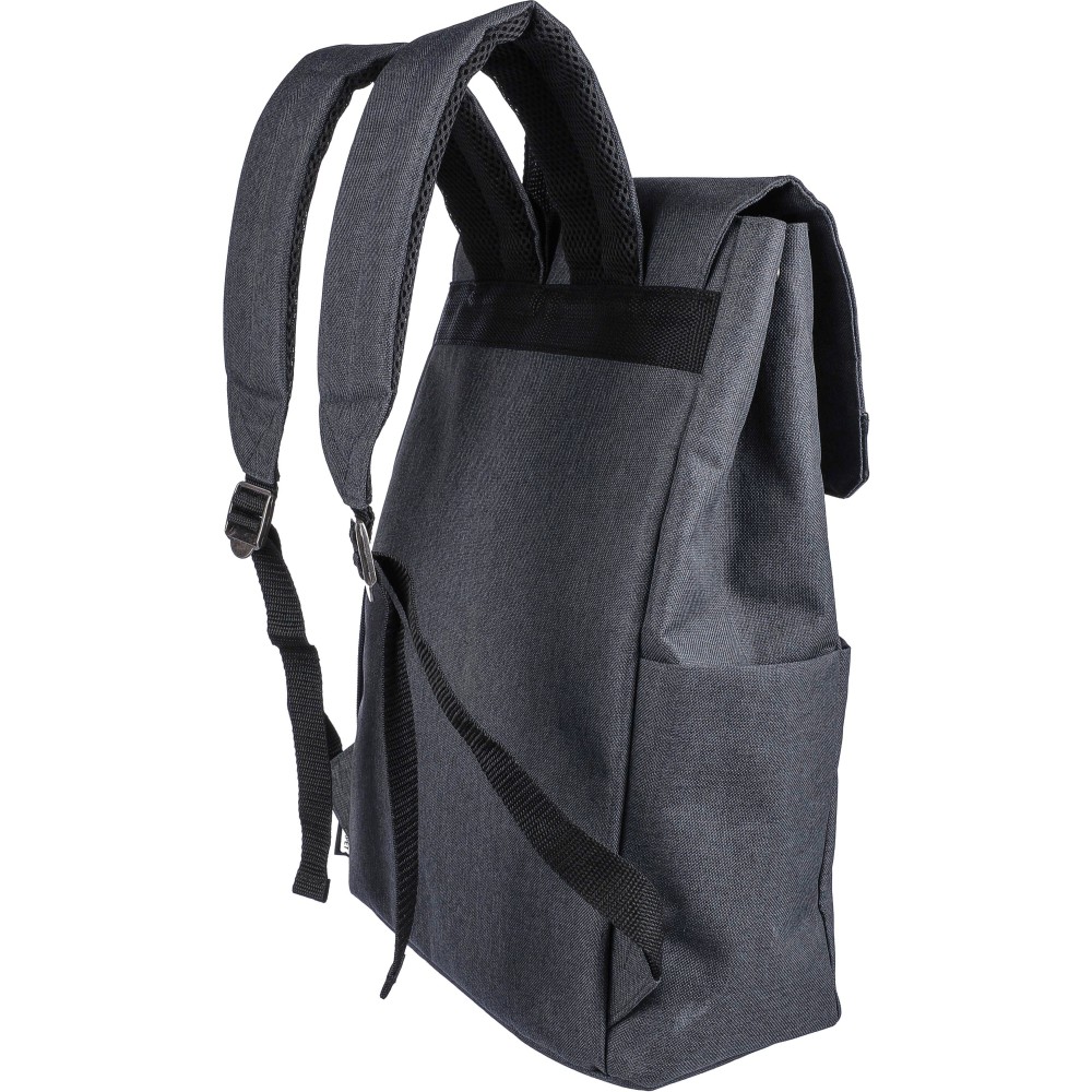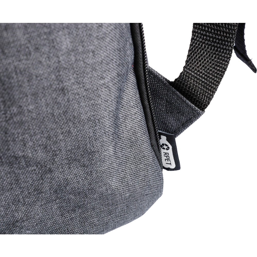 Laptophátizsák 15 -es laptop számára, PVC részletekkel és 210D béléssel. Kis cipzáras elülső zsebbel rendelkezik, benne egy kulcsokhoz rögzíthető karabinerrel, egy cipzáras oldalzsebbel, egy normál oldalzsebbel, valamint egy nagy, mágneszáras rekesszel, amely laptopzsebet tartalmaz. Oldalt nyomógombokkal zárható, ha nincs teljesen megtöltve. Állítható, szellőző pántokkal. Az elülső részen rPET anyagra utaló címke található. Anyaga: 600D poliészter vászon. Emblémázás: Szitanyomás