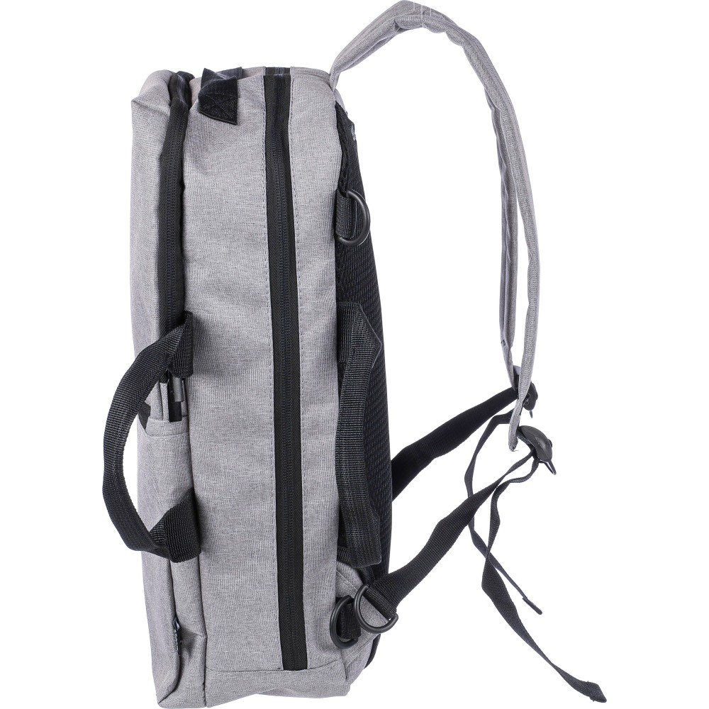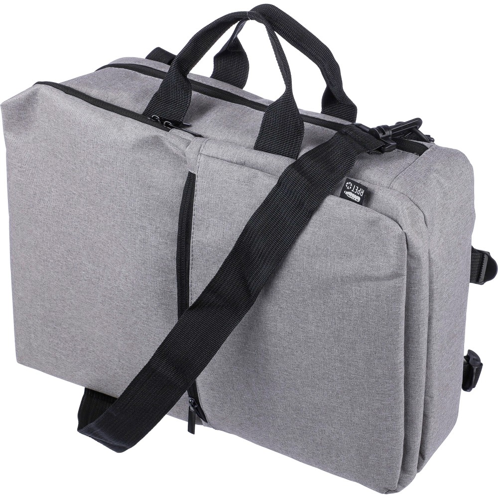 Hátizsák és laptoptáska 15 -es készülékhez. Kézipoggyász méretű. Hordozófüllel a tetején, állítható vállpántokkal és két oldalsó fogantyúval. Az állítható pántok a párnázás mögé rejthetők, így az oldalsó fogantyúkkal is hordozható. Tépőzáras laptoprekesszel és kis cipzáras zsebbel rendelkezik. Szellőző, párnázott hátoldallal. Terhelhetősége kb. 8 kg. RPET alapanyagra utaló címkével. Anyaga: 300D RPET poliészter. Emblémázás: Hímzés, Szitanyomás