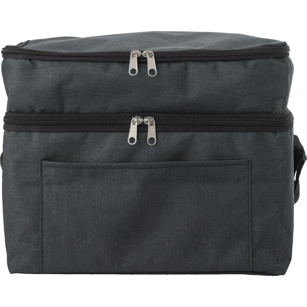 RPET hűtőtáska belül alumínium fólia szigeteléssel, két cipzáros rekesszel és első zsebbel, vállpánttal. Emblémázás: Szitanyomás