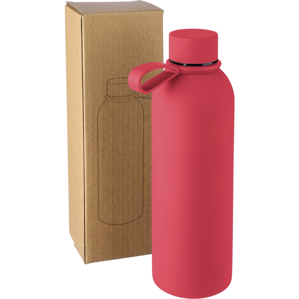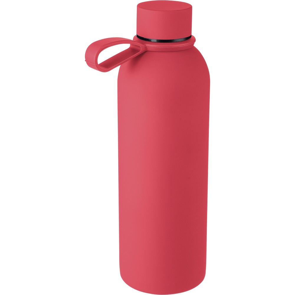 Újrahasznosított rozsdamentes acélból készült duplafalú vákuumpalack, 500 ml-es. 304-es rozsdamentes acél belsővel és 201-es rozsdamentes acél külsővel. Gumírozott felülettel, fém díszítésű csavaros PP kupakkal és szilikon hordfüllel. Gravírozott, újrahasznosított logóval. Csomagolása barna papírdoboz. Emblémázás: Gravírozás