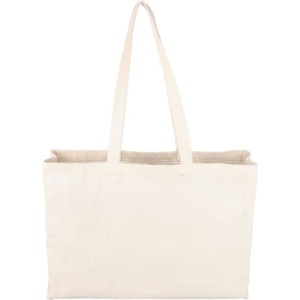 Bevásárlótáska 10 cm széles talppal. Maximális teherbírás: kb. 8 kg. Anyaga: Oeko-Tex natúr pamut 280 g/m2. Emblémázás: Szitanyomás