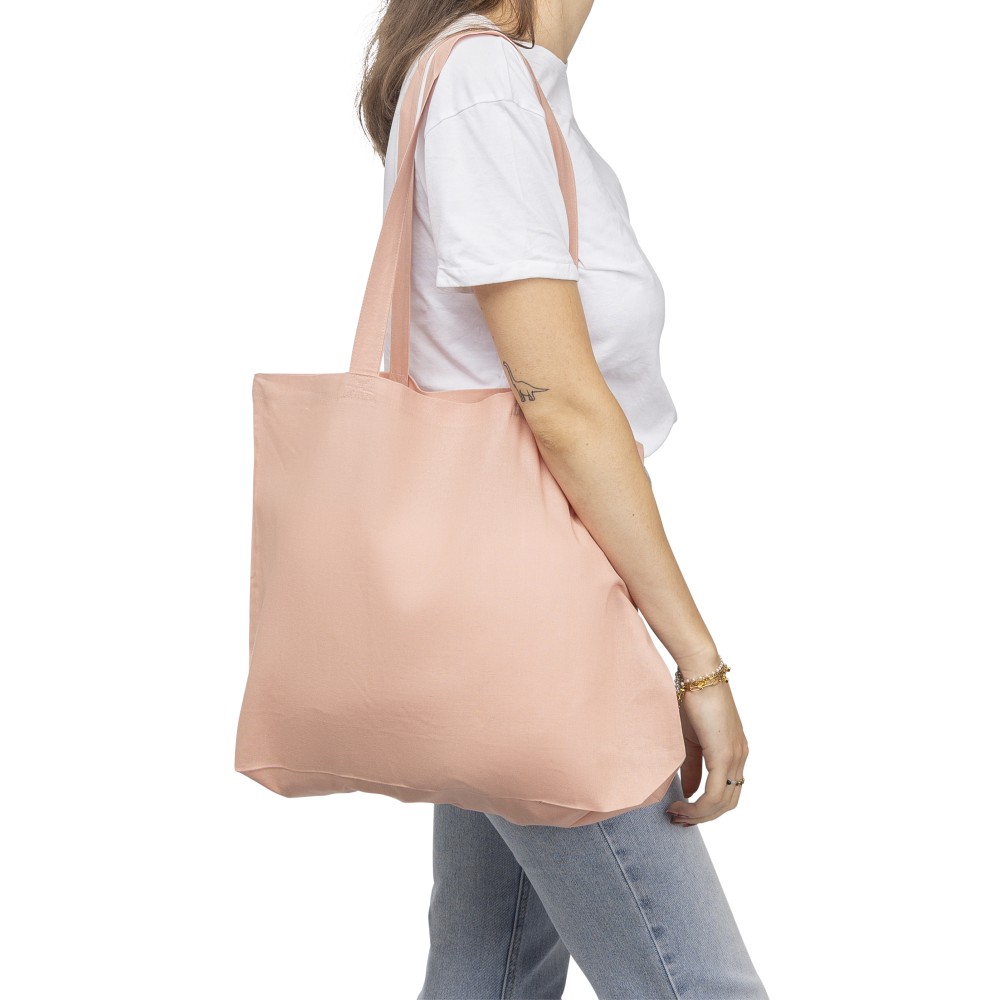 Oeko-Tex minősítésű, 140 g/m2 pamutból készült bevásárlótáska 10 cm-es talppal és 70 cm hosszúságú, 2,5 cm szélességű hosszú fülekkel. Pasztell színekben elérhető: PMS 9562U (zöld), 162U (narancs), 317U (kék) és 522U (lila). Oeko-Tex címkével ellátva.