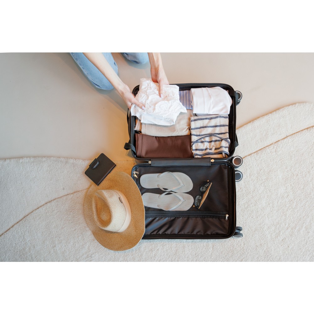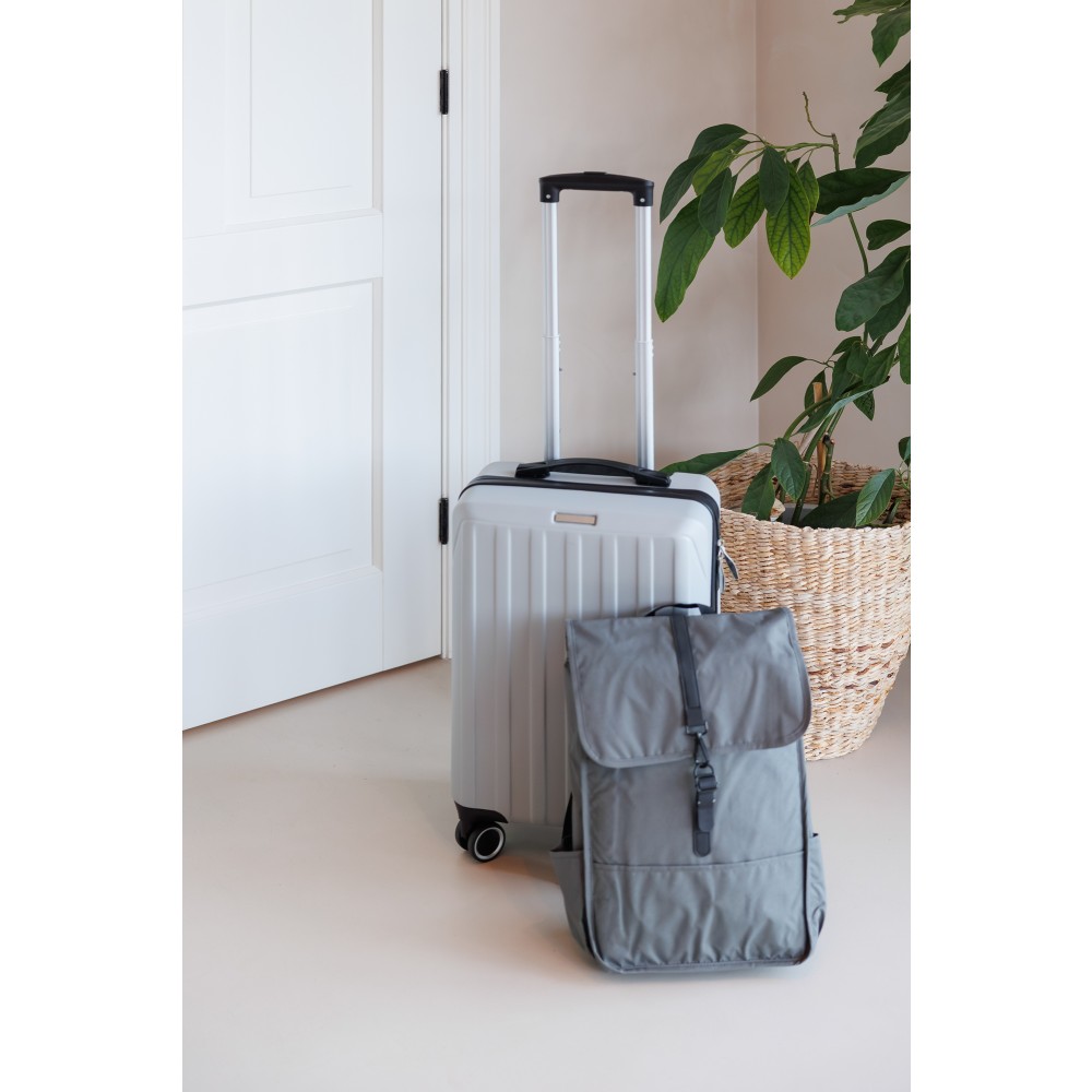 Keményfedeles ABS gurulós bőrönd 8 kerékkel (4x2), és háromszintű fém fogantyúrendszerrel. Felső műanyag fogantyút, számkombinációs zárat és 3M ragasztócsíkkal rögzíthető gravírozható táblát tartalmaz. A belső bélés anyaga 210D, a táskán belül 3 rekesz áll rendelkezésre: U-cipzáras zseb, hálós zseb és X-alakú, csattal záródó gumis heveder. Űrtartalom: 30 liter. Csomagolása barna papírdoboz. Emblémázás: Gravírozás
