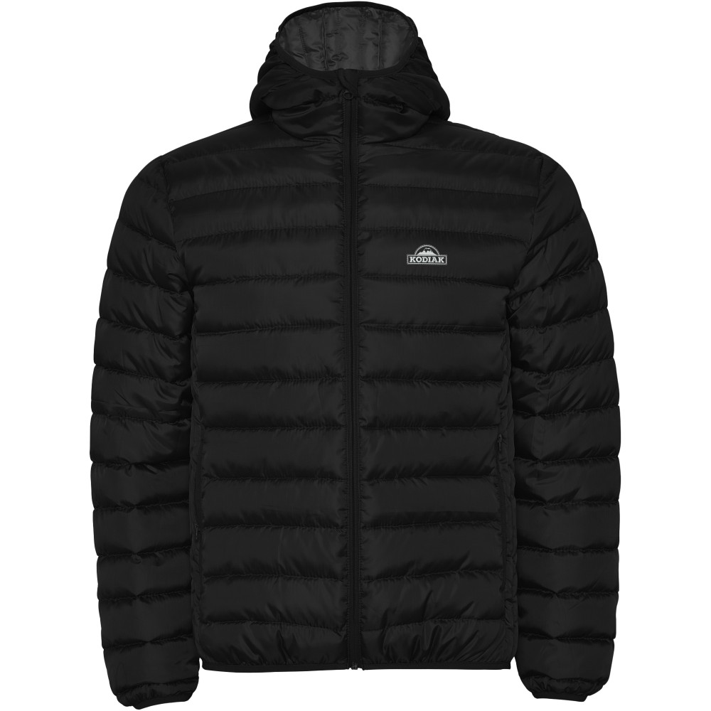 Pehely tapintású férfi steppelt dzseki kapucnival, tasakkal. Fordított cipzárakkal, hozzá illő állvédővel. Két cipzáras elülső zseb. Gumis kézelő, a alj- és a kapucniszegély. Kontrasztos belső bélés. Könnyű és összehajtható ruhadarab. Vízálló. Szélálló modell. 100% poliészter, 290 g/m2. Bélés: 100% poliészter. Töltet: 100% poliészter. Emblémázás: Hímzés
