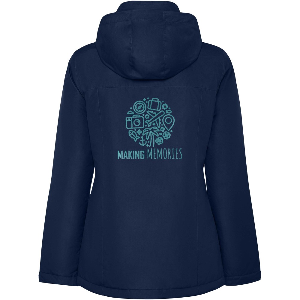 Vízálló bélelt parka nőknek. Karcsúsított fazon. Magas gallérral és levehető kapucnival, tépőzáras záródással. Oldalsó zsebek cipzárral, belső zseb tépőzáras záródással. Állítható mandzsetták tépőzáras övhurkokkal. Belső hozzáférés a hátsó és a bal mellkasi megerősítésekhez. Emblémázás: Hímzés