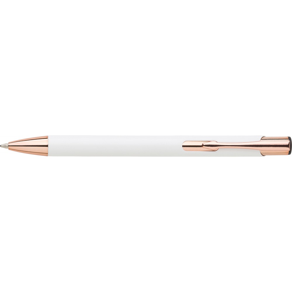 Alumínium golyóstoll matt felülettel, rózsaarany részletekkel, kék tollbetéttel. Emblémázás: Gravírozás, Tamponnyomás, UV nyomtatás