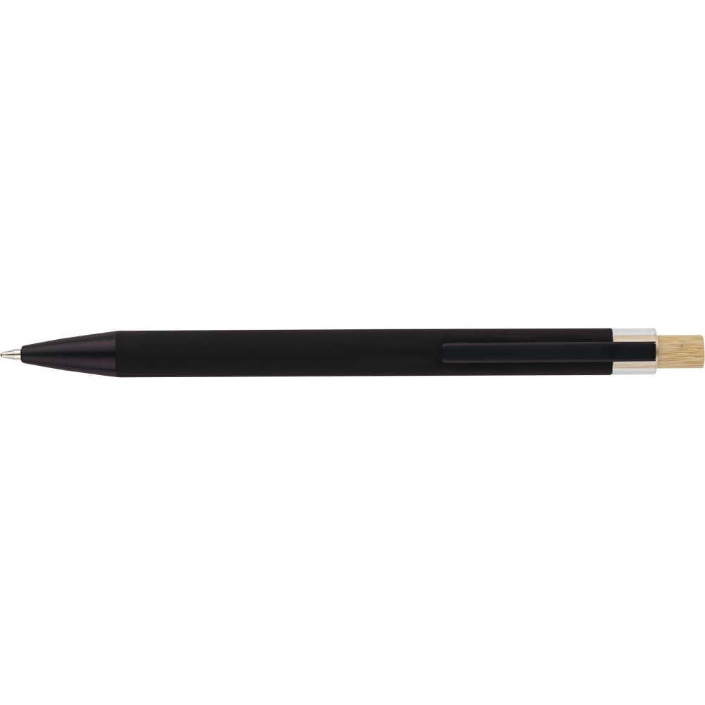 Újrahasznosított alumíniumból készült golyóstoll bambusz nyomógombbal és AS műanyag díszítéssel, fém klippel és a toll színével harmonizáló műanyag tollheggyel. A tolltesten lézergravírozott recycled (újrahasznosított) alapanyagra utaló logó található. Megközelítőleg 800 méter íráshosszúságú, kék színű tollbetéttel.