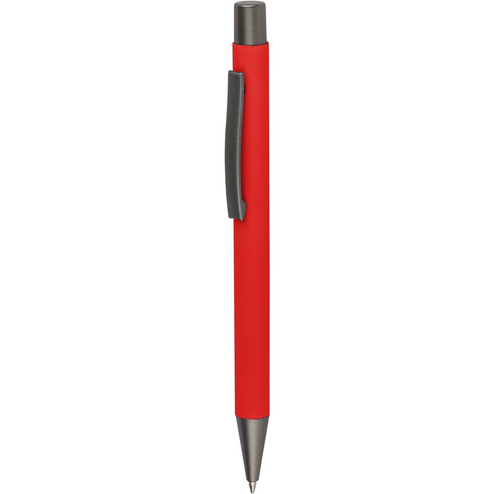 Újrahasznosított alumínium golyóstoll lágy tapintású gumírozott felülettel és kék tollbetéttel. Sötétszürke kiegészítőkkel és a bevonat alatti tükörhatású réteggel tervezve a látványos gravírozási eredmény érdekében. Nyomógombos szerkezettel és gravírozott újrahasznosított logóval.