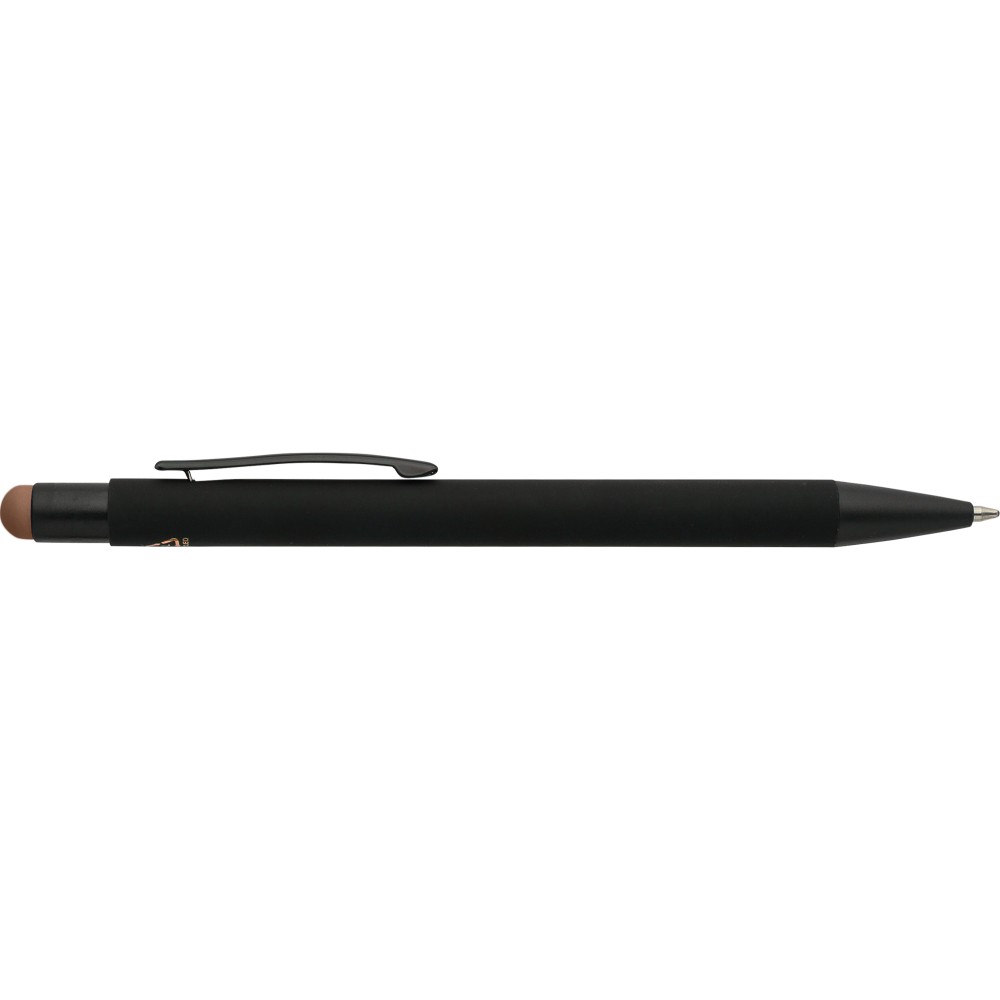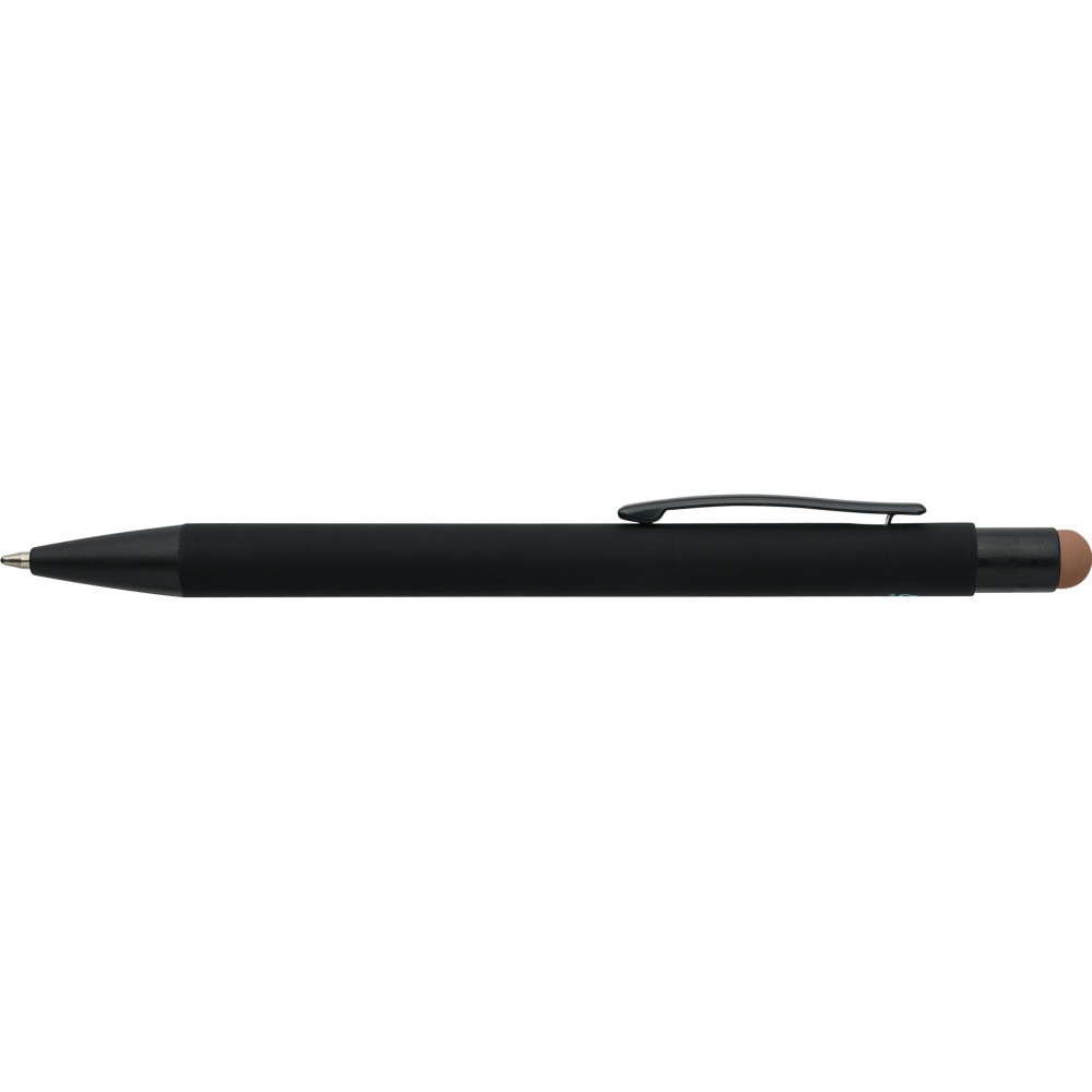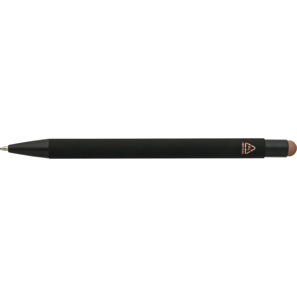 Újrahasznosított alumínium golyóstoll fekete, gumírozott felülettel és kék tollbetéttel. Színben illeszkedő kiegészítőkkel ? beleértve a belső tolltestet és az érintőképernyőkhöz használható stylus véget ?, amelyek kifinomult kontrasztot alkotnak gravírozáskor. Nyomógombos szerkezettel és gravírozott újrahasznosított logóval.