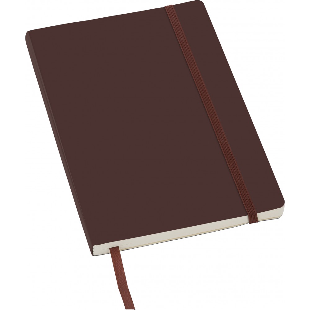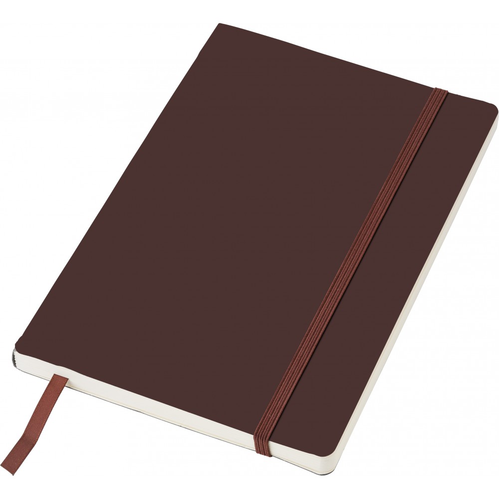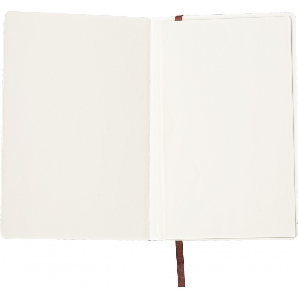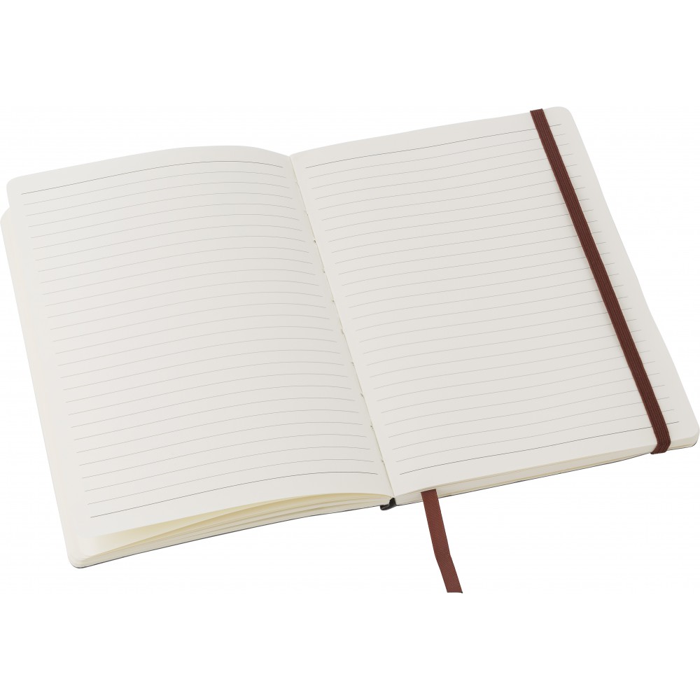 Puhafedelű, hajlékony borítójú füzet 80 vonalas lappal, a borító belsejében zsebbel, gumis záródással és könyvjelzővel. PU. Emblémázás: Tamponnyomás