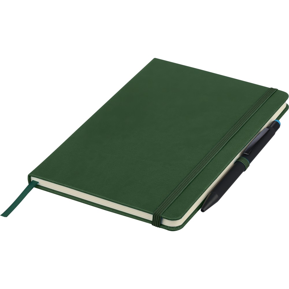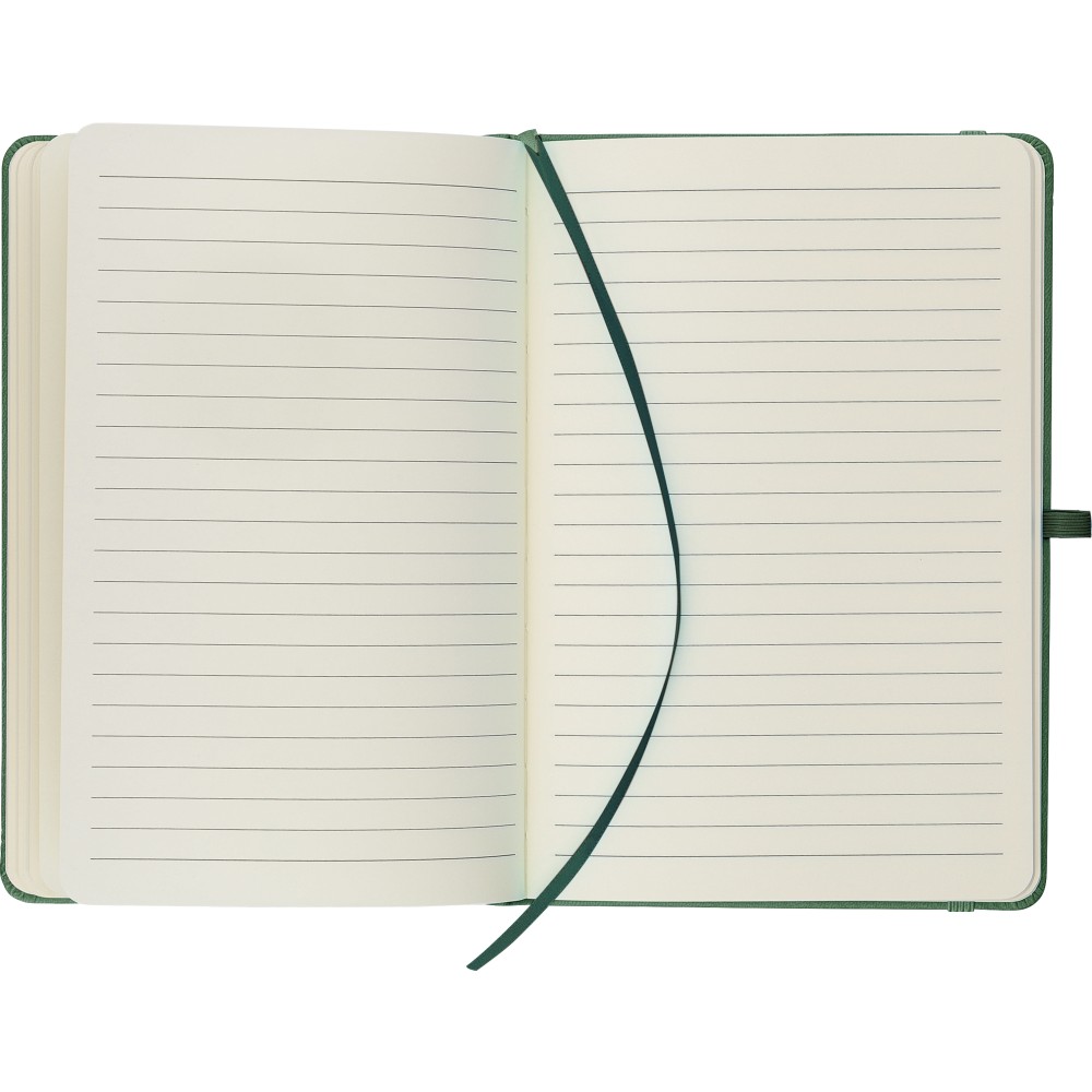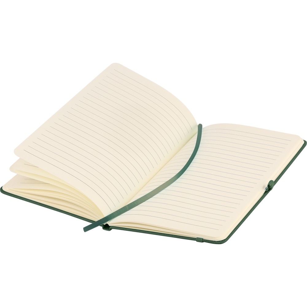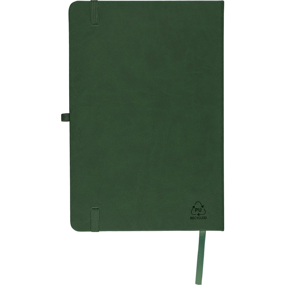 A5-ös jegyzetfüzet újrahasznosított kemény PU borítóval, a hátoldalán dombornyomott újrahasznosított logóval. Tartós és rugalmas anyagból készült, amely kényelmes fogást, párnázottságot és hosszan tartó használatot biztosít. A borító lézergravírozásra alkalmas, amely során finom, tone-on-tone (színazonos) hatás érhető el. 80 vonalas, 70 g/m2 súlyú lapot tartalmaz, színben illeszkedő gumírozott rögzítőpánttal, könyvjelző szalaggal és tolltartó hurokkal. A füzetben használt papír FSC Mix tanúsítvánnyal rendelkezik.