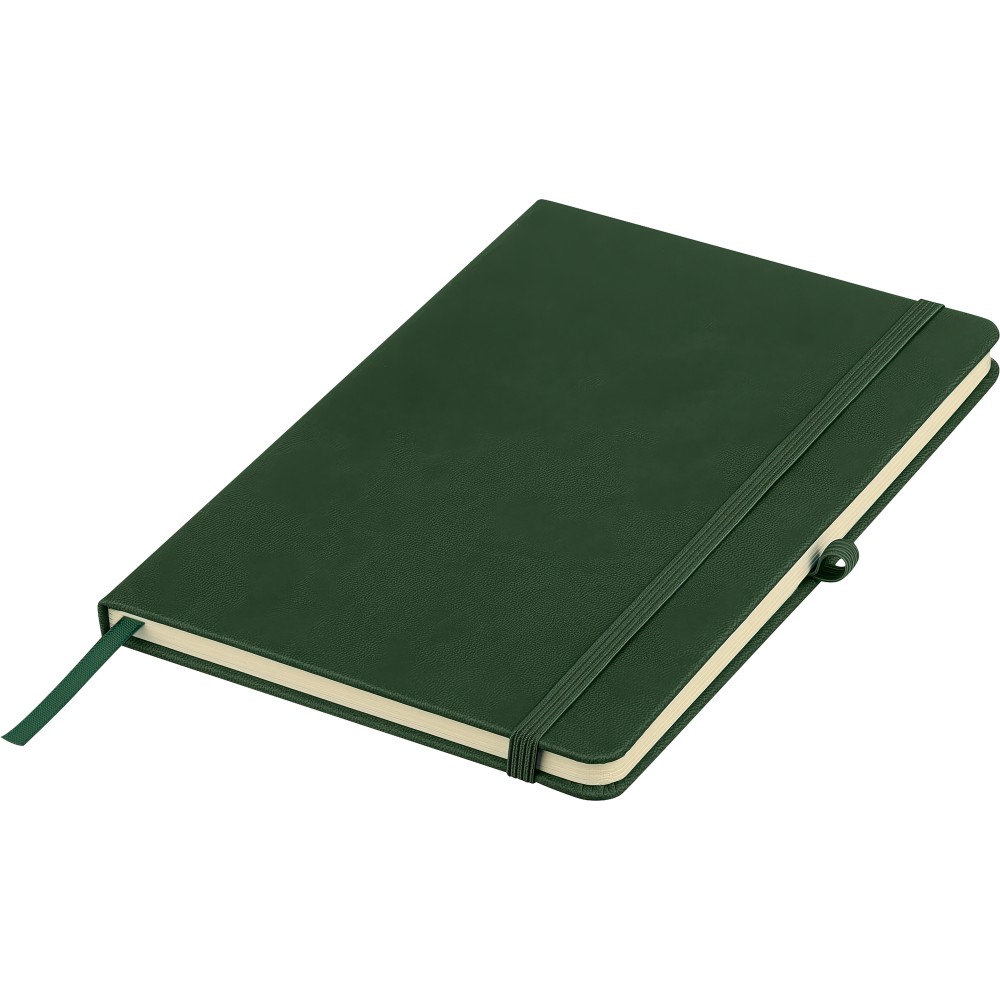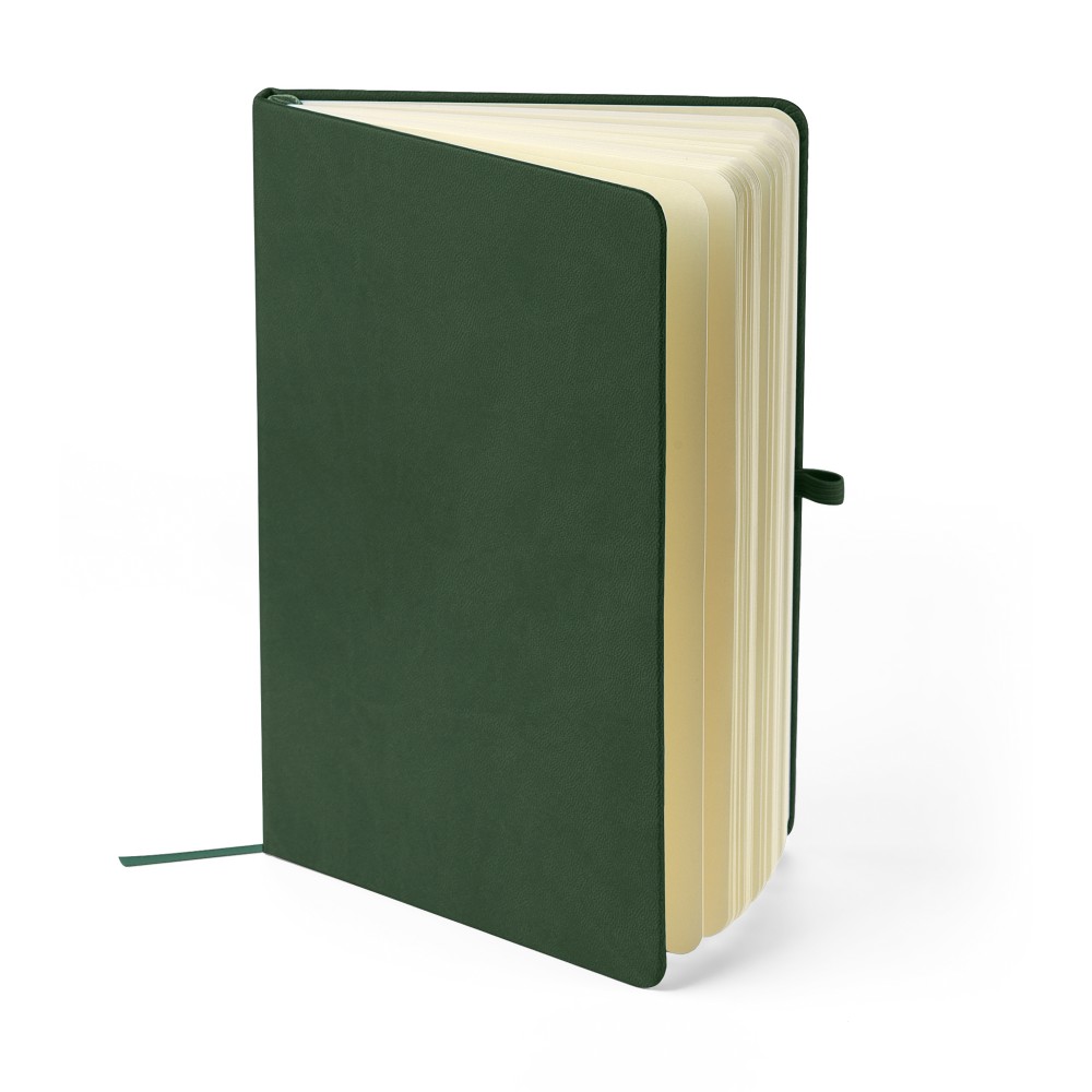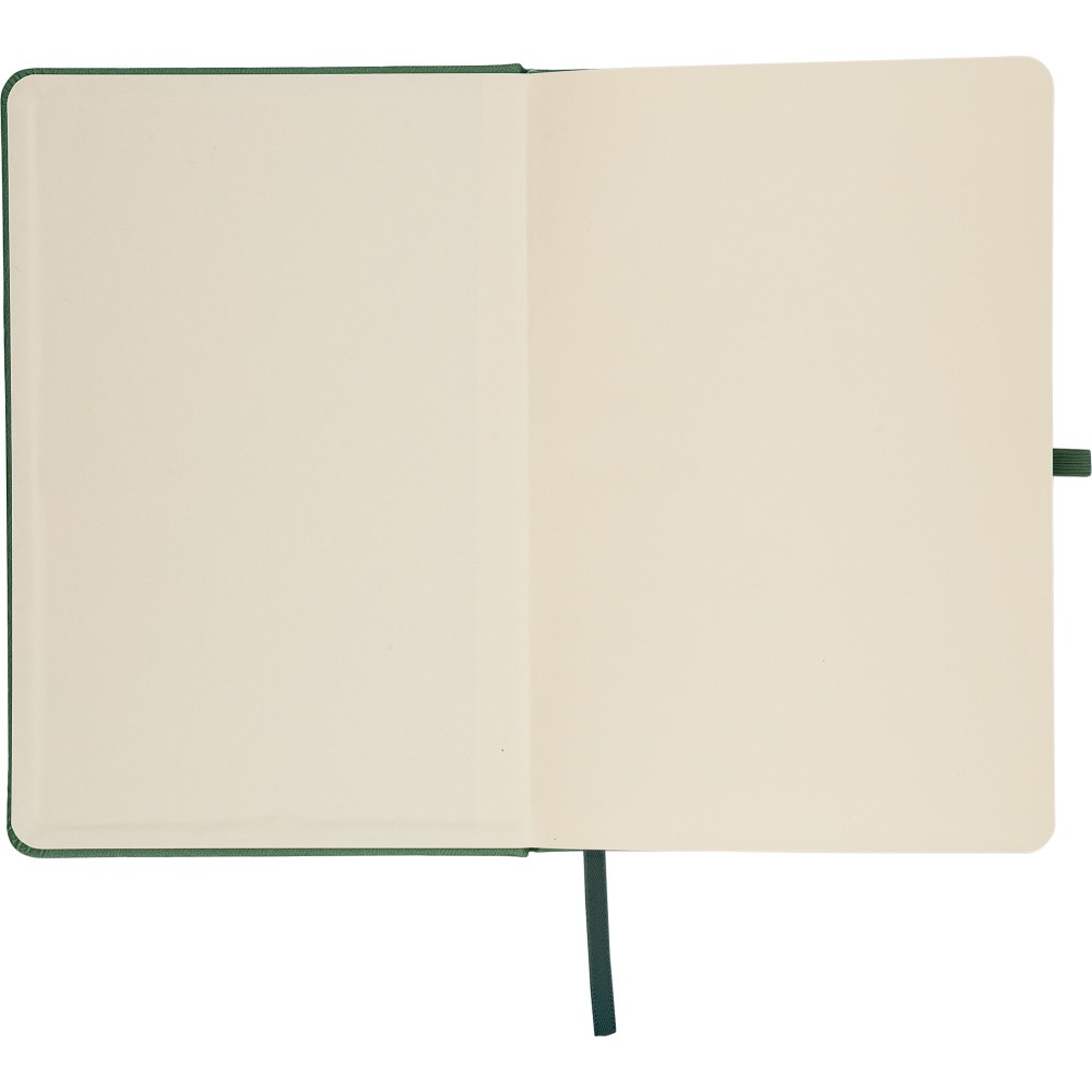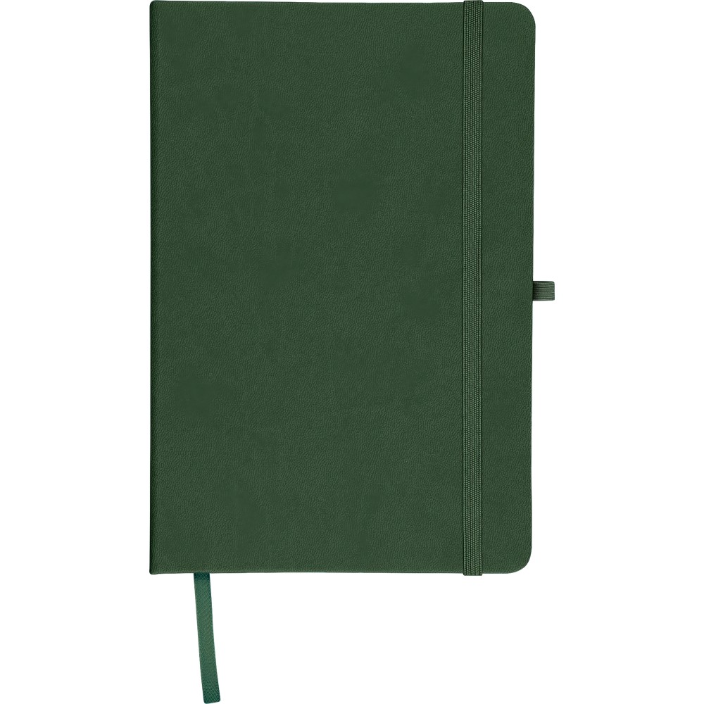 A5-ös jegyzetfüzet újrahasznosított kemény PU borítóval, a hátoldalán dombornyomott újrahasznosított logóval. Tartós és rugalmas anyagból készült, amely kényelmes fogást, párnázottságot és hosszan tartó használatot biztosít. A borító lézergravírozásra alkalmas, amely során finom, tone-on-tone (színazonos) hatás érhető el. 80 vonalas, 70 g/m2 súlyú lapot tartalmaz, színben illeszkedő gumírozott rögzítőpánttal, könyvjelző szalaggal és tolltartó hurokkal. A füzetben használt papír FSC Mix tanúsítvánnyal rendelkezik.