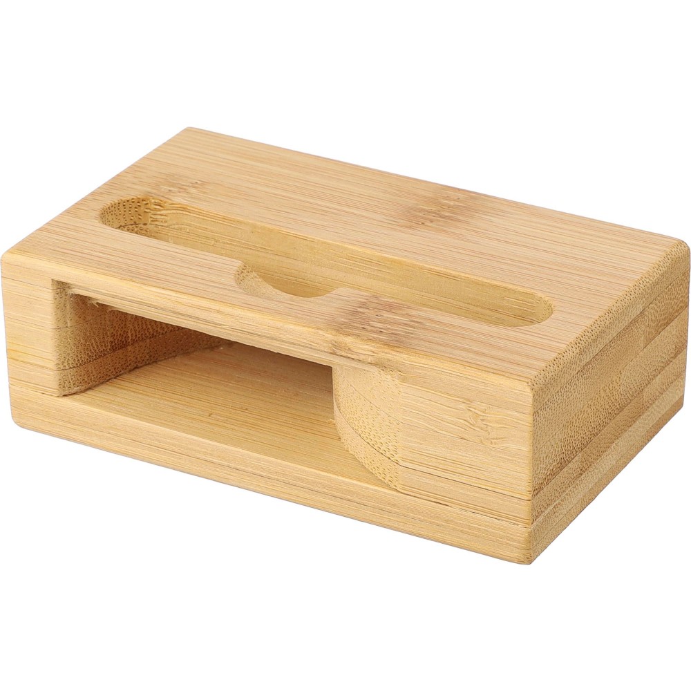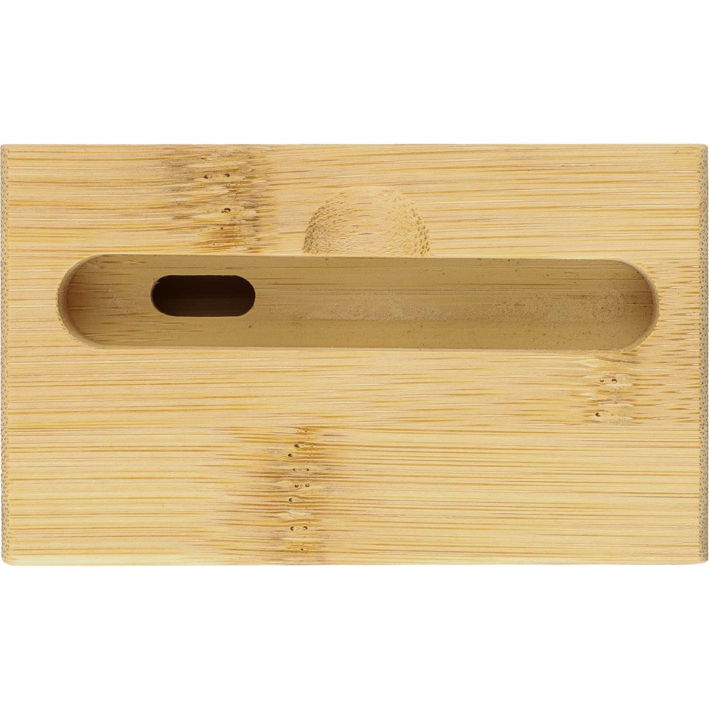 Bambusz telefontartó hangszóró funkcióval. Zenelejátszás közben az alsó részen keresztül erősíti a hangot áram vagy elem használata nélkül. Telefontartó nyílás méretei: kb. 8,2 x 1,2 cm. Egyenként barna kartondobozba csomagolva. Emblémázás: Gravírozás, Tamponnyomás