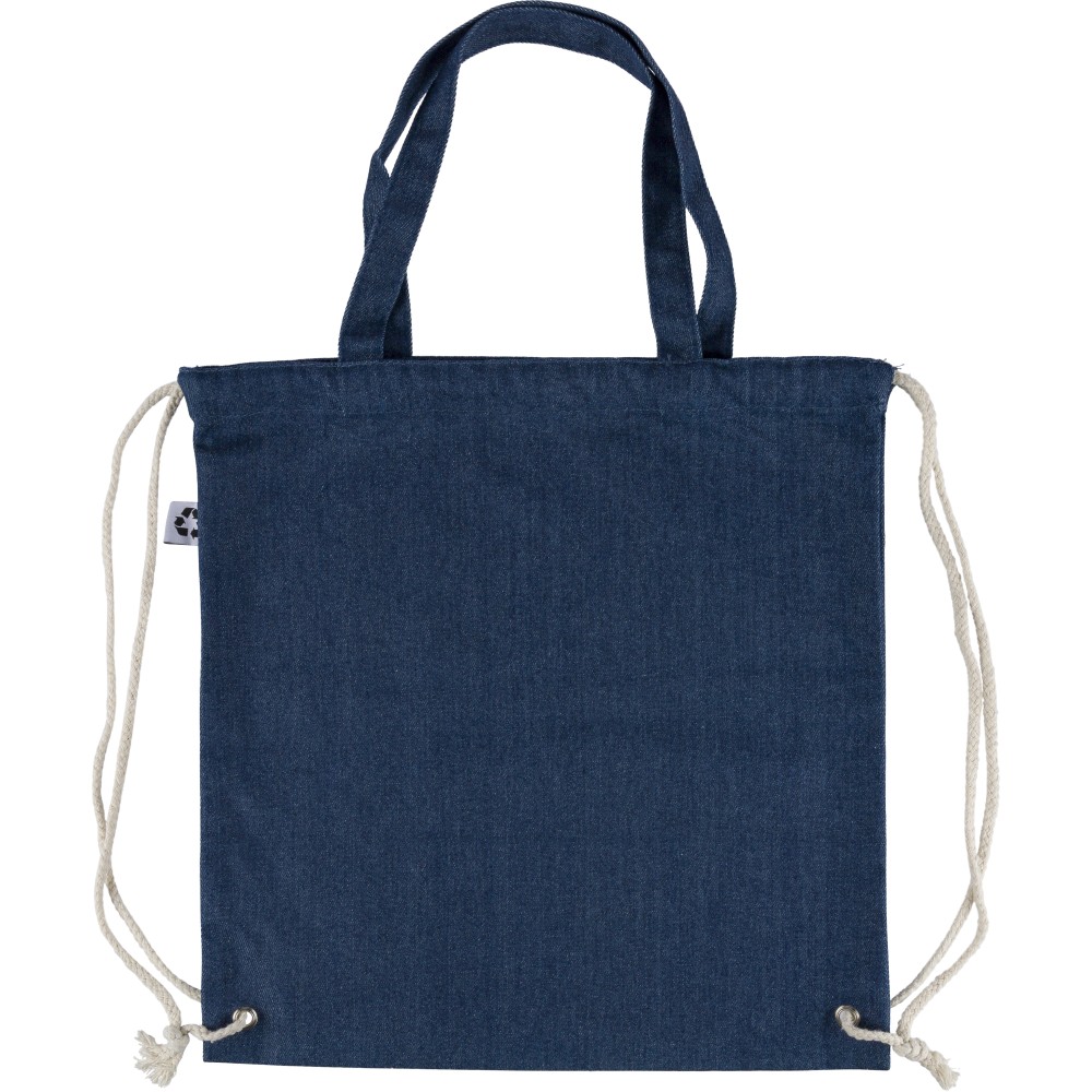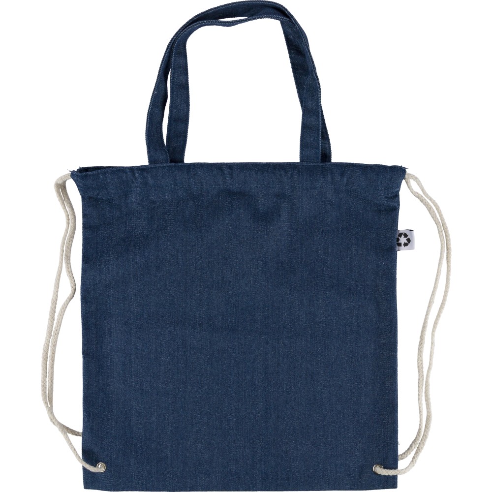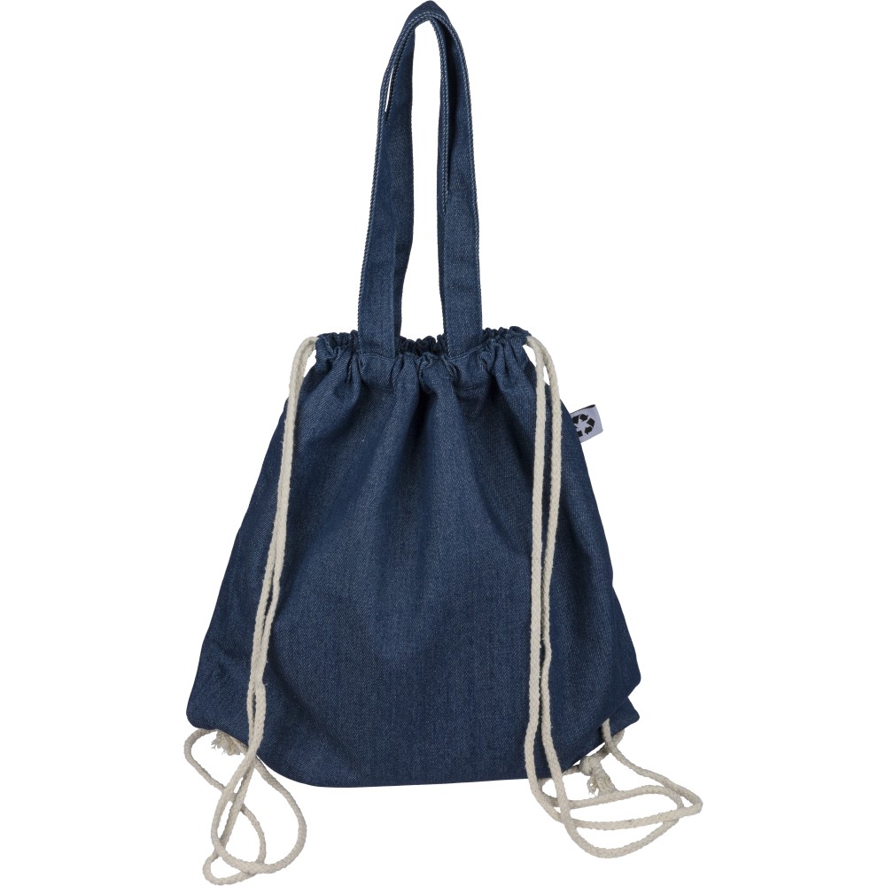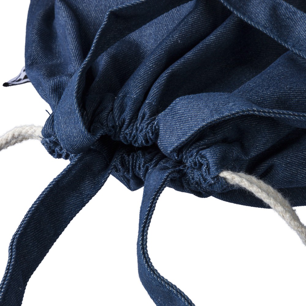 Újrahasznosított farmeranyagból készült húzózsinóros táska 40 × 38 cm méretben, 2,5 × 50 cm hosszúságú fülekkel és húzózsinóros záródással. A külső felületen újrahasznosított alapanyagra utaló címke található, vállpántként vagy kézi hurokként is hordható. Emblémázás: Szitanyomás