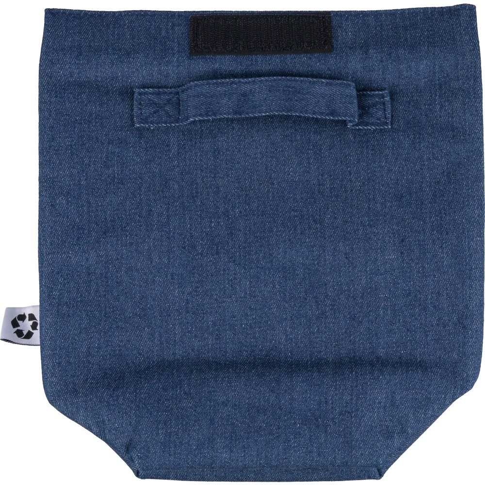 Újrahasznosított farmeranyagból készült, 27 × 10 × 31 cm méretű roll-top kialakítású hűtőtáska tépőzáras záródással, PEVA belső réteggel és rövid fogantyúval. Elülső zsebbel és a külső felületen elhelyezett újrahasznosított alapanyagra utaló címkével ellátva.