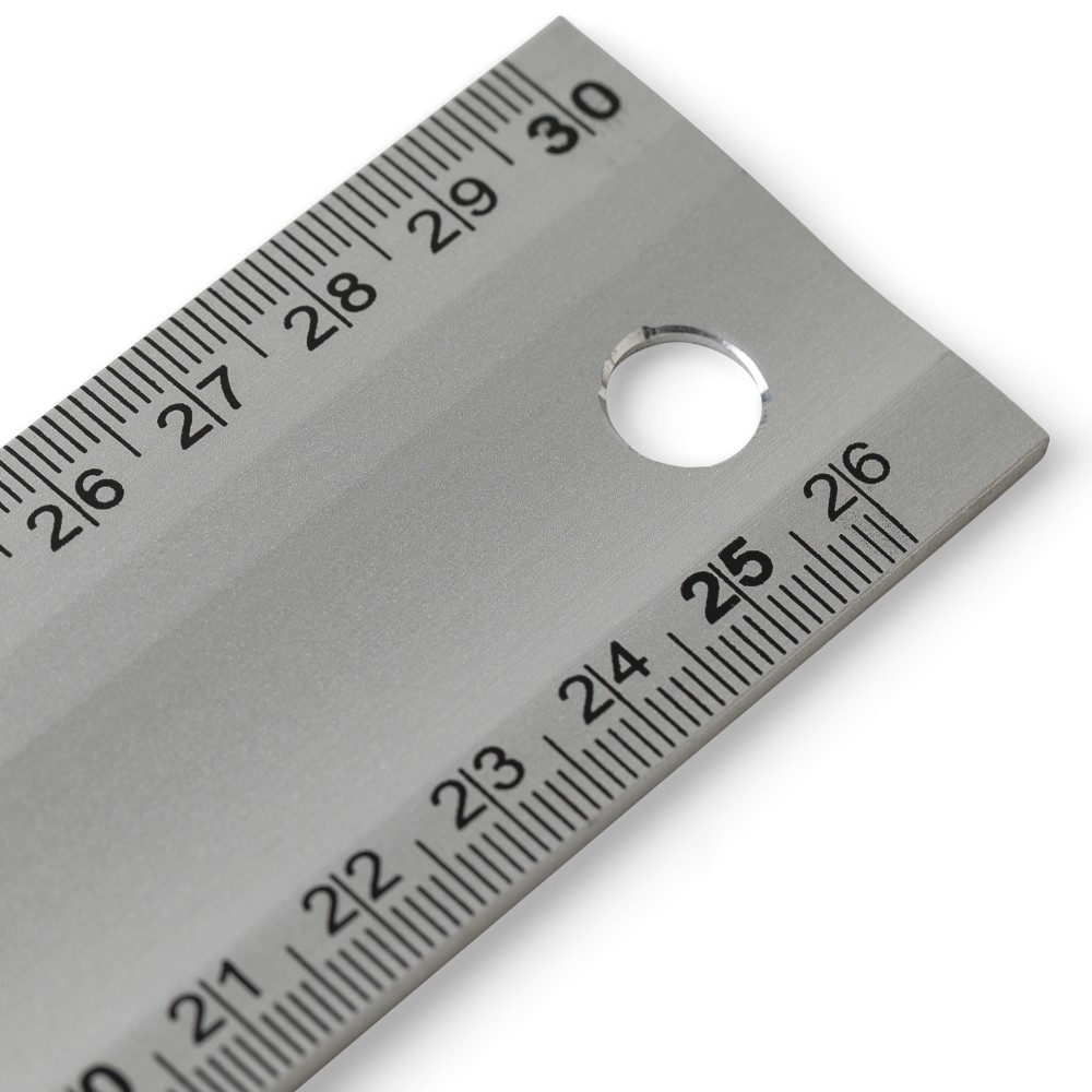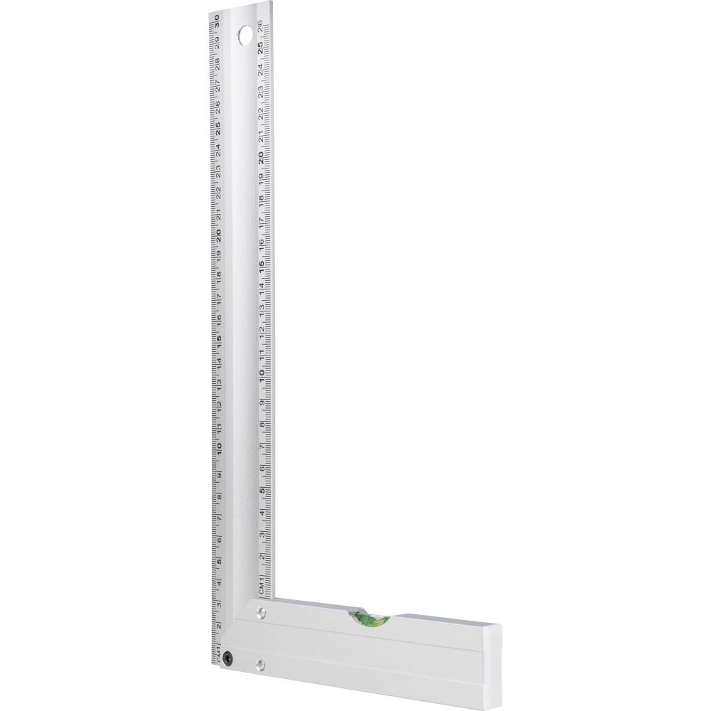 Alumíniumból készült derékszögmérő szintezővel, 30 cm hosszúsággal, centiméter beosztással. Praktikus kialakítás a pontos méréshez és szintezéshez. Darabonként illusztrációval ellátott barna kartondobozba csomagolva. Emblémázás: Gravírozás