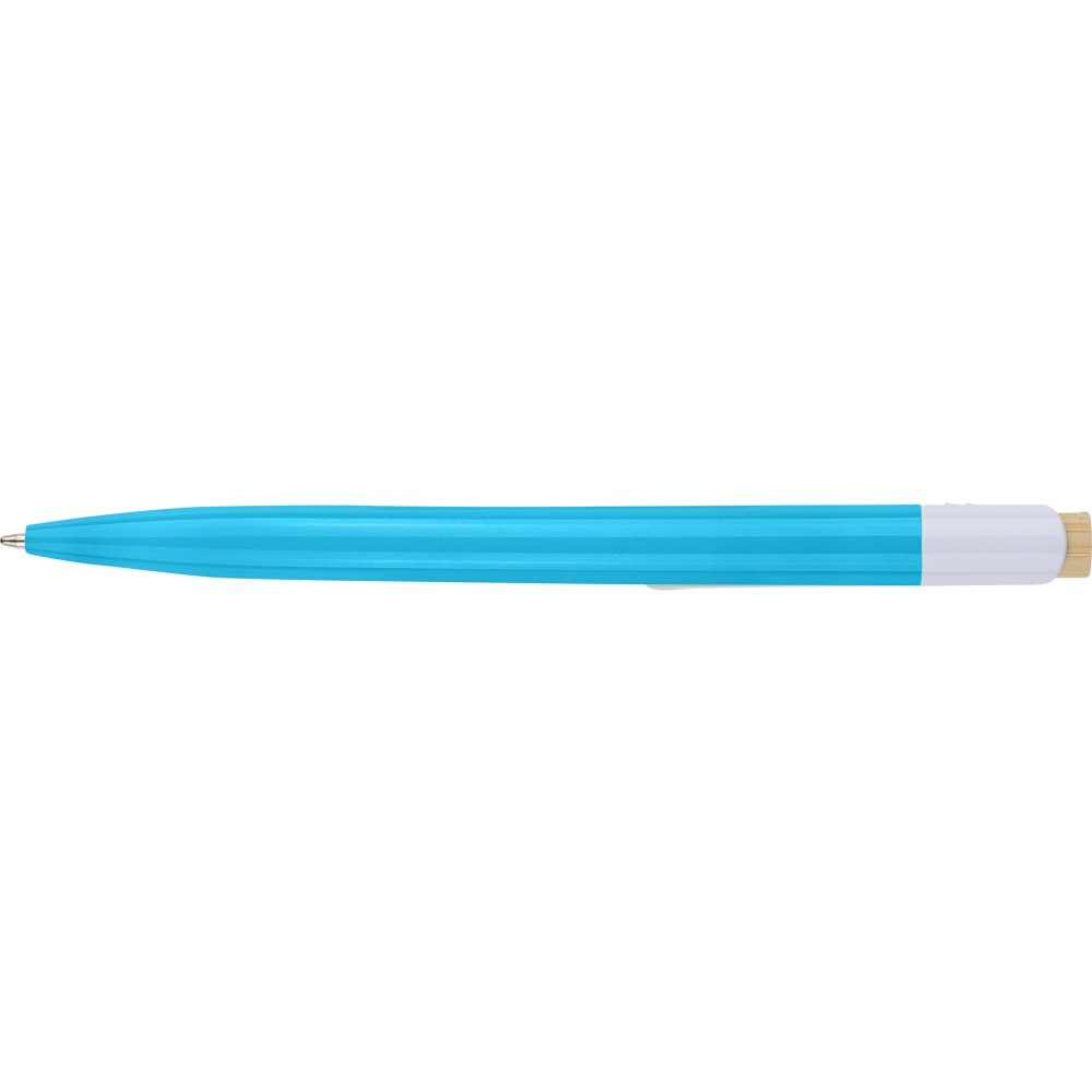 Újrahasznosított ABS-ből készült golyóstoll bambusz nyomógombbal és fehér klippel, digitális nyomtatásra alkalmas kivitelben. A tolltesten fröccsöntés során elhelyezett recycled (újrahasznosított) alapanyagra utaló logó található. Megközelítőleg 600 méter íráshosszúságú, kék színű tollbetéttel.