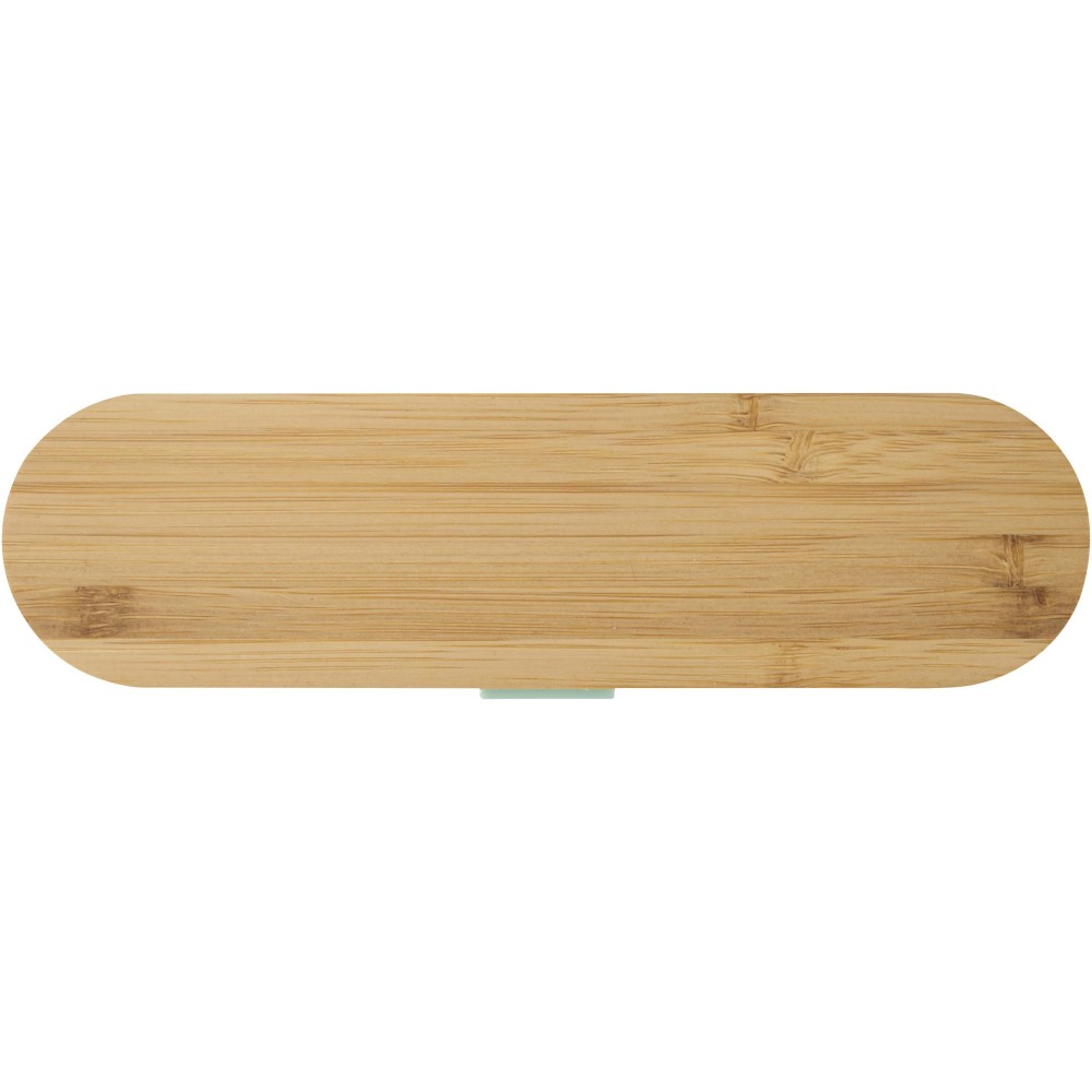 Újrafelhasználható evőeszközkészlet bambusz fedéllel, amely tartalmaz egy villát, kést, kanalat, szívószálat és egy szívószál tisztító kefét - ideális megoldást kínál az útközbeni étkezésekhez. Kompakt kialakításának és egyszerű tisztíthatóságának köszönhetően tökéletes kiegészítő uzsonnás dobozok mellé, utazáshoz vagy irodai használatra. Emblémázás: Gravírozás, Tamponnyomás, UV nyomtatás