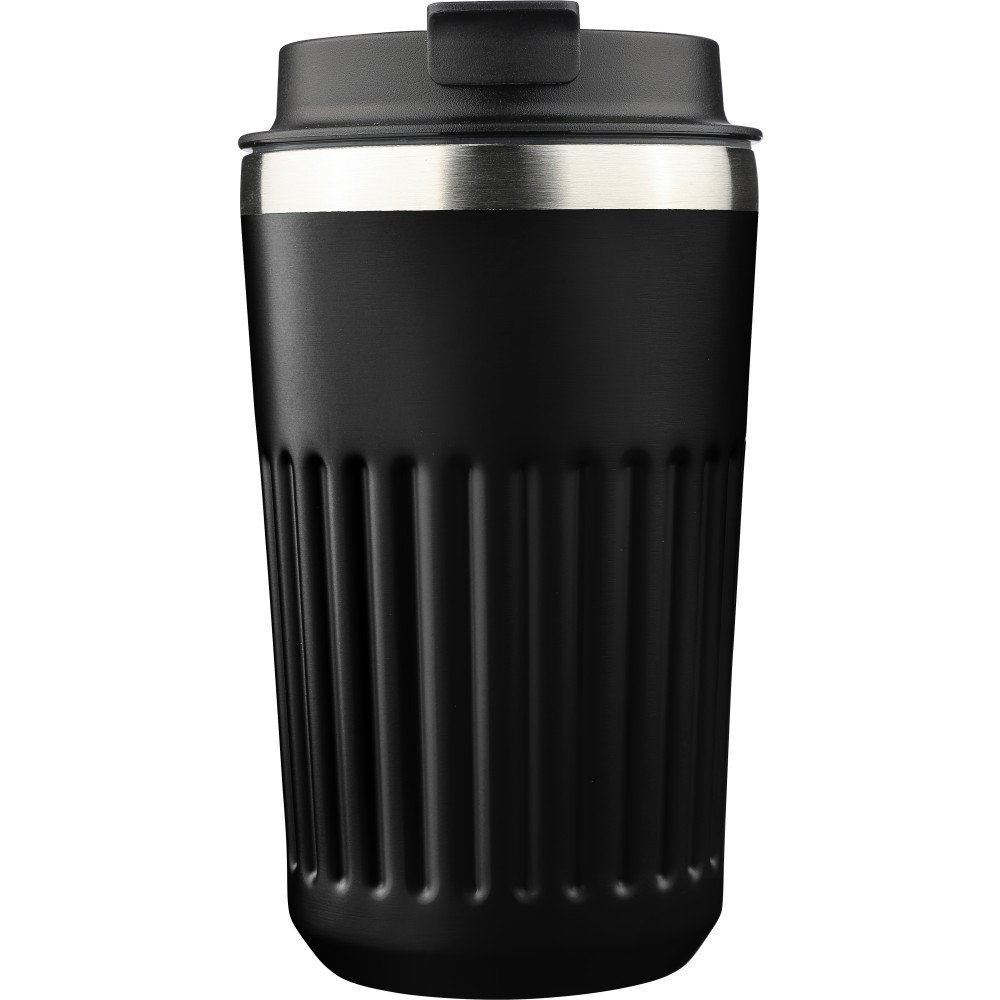 Újrahasznosított rozsdamentes acélból készült utazópohár 400 ml űrtartalommal, duplafalú kialakítással és külső bordázott felülettel. Belső része 304-es, külső része 201-es rozsdamentes acél, PP fedéllel. A pohártesten gravírozott recycled (újrahasznosított) alapanyagra utaló logó található. Darabonként barna kartondobozba csomagolva. Emblémázás: Gravírozás, Tamponnyomás