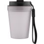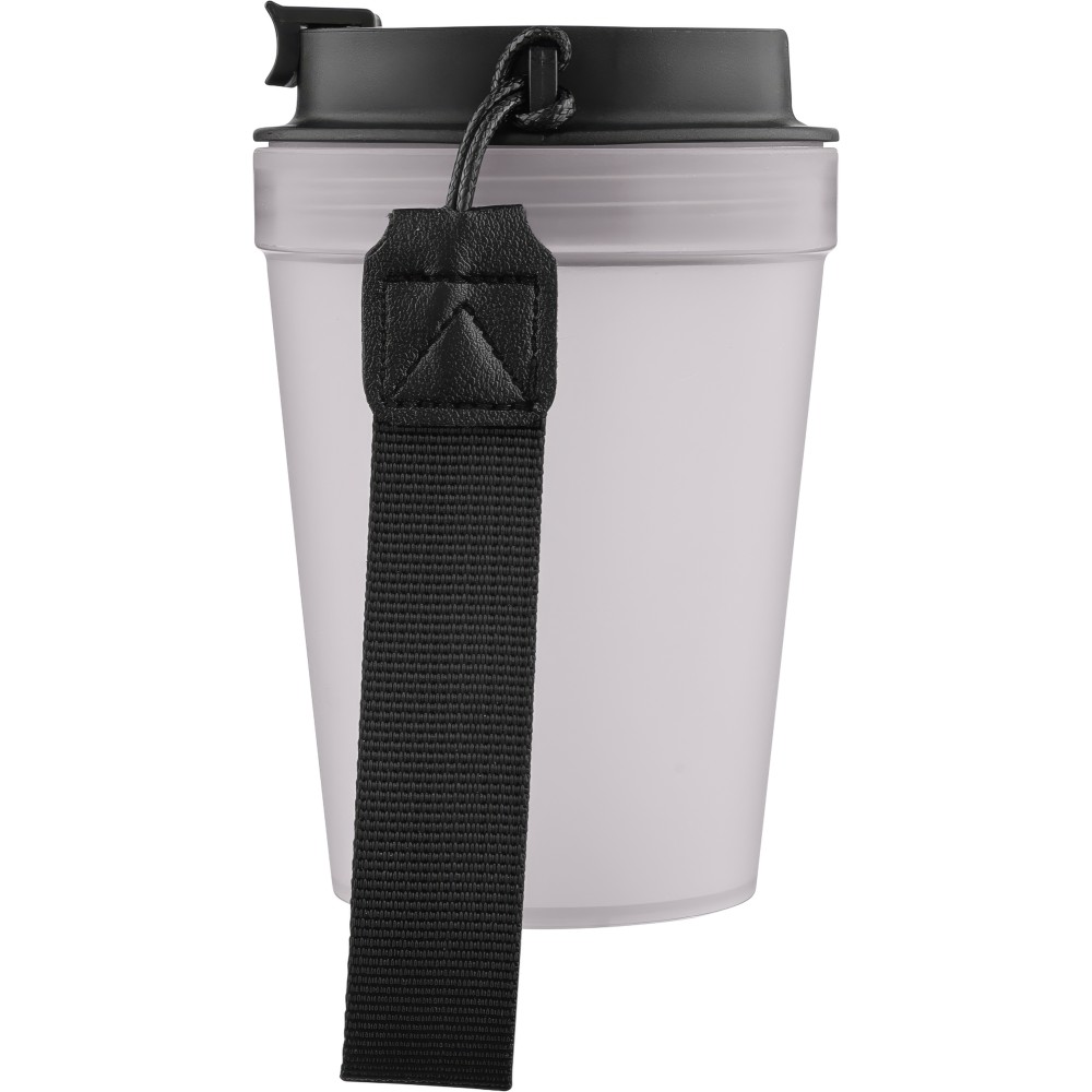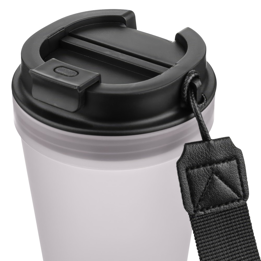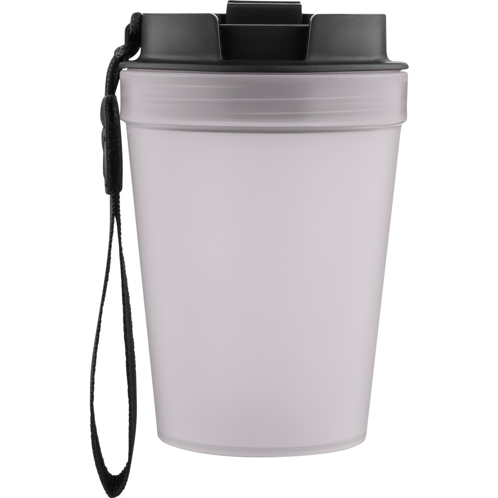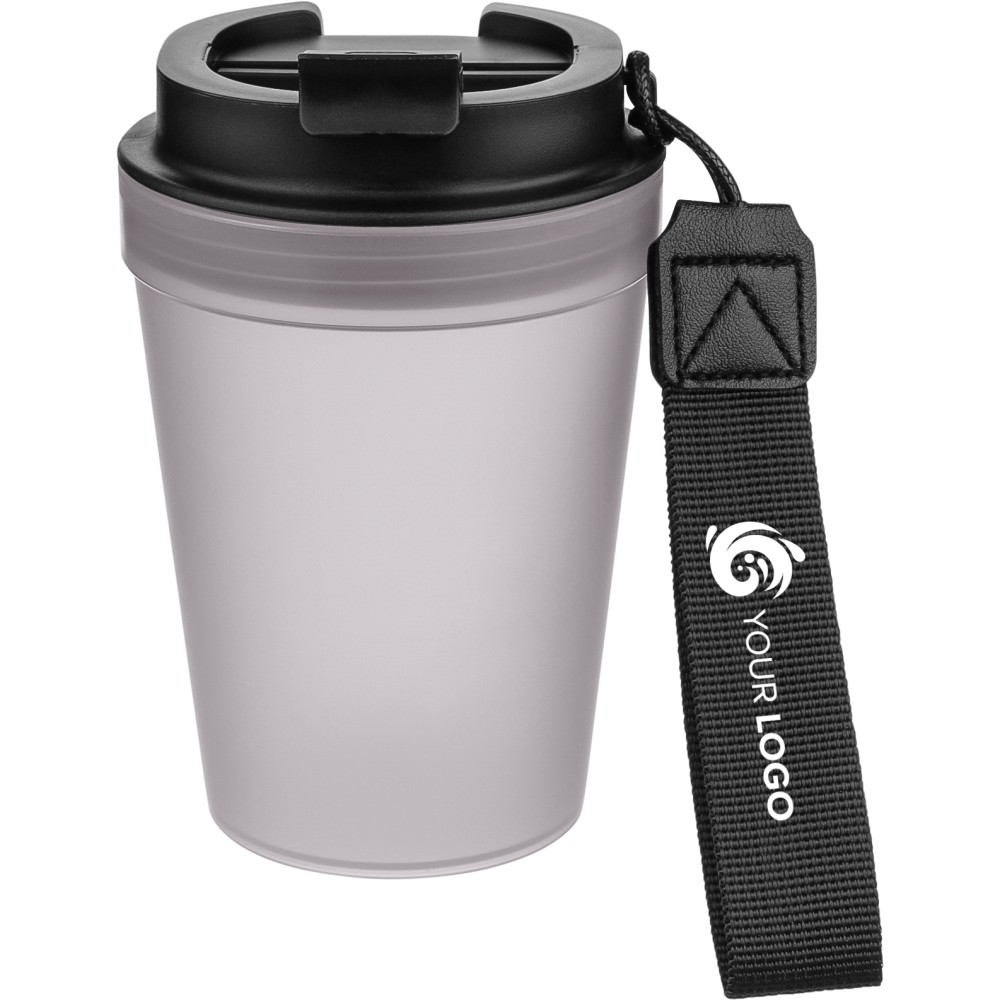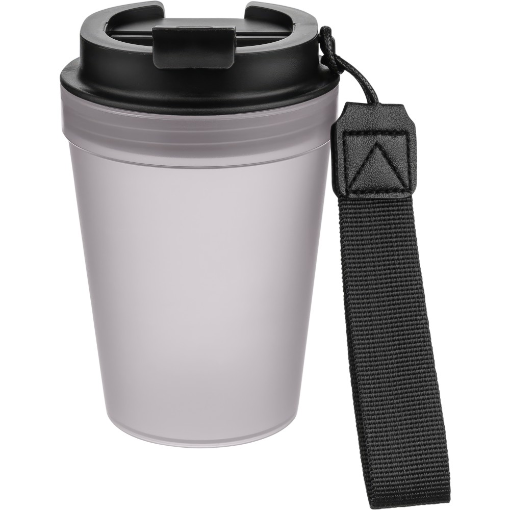 Átlátszó, szimplafalú ivópohár 350 ml-es űrtartalommal, vastagfalú kialakítással. Csavaros fedéllel és poliészter csuklópánttal rendelkezik a könnyű hordozhatóság érdekében. Tartós, ütésálló, megbízható termék. Meleg italokhoz is alkalmas, de kérjük, vegye figyelembe, hogy az egyfalú szerkezet miatt hőátadás előfordulhat.