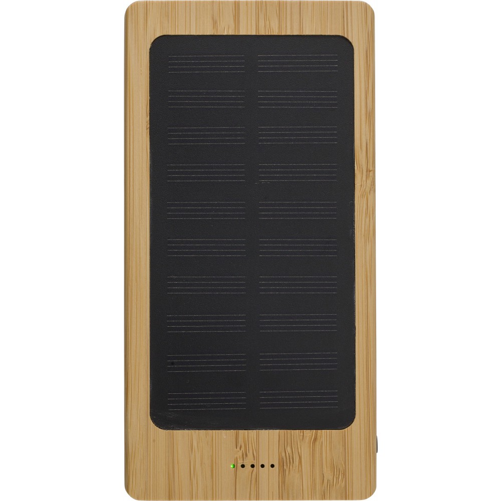 Bambusz napelemes powerbank 8.000 mAh kapacitással. Két USB és egy micro USB csatlakozóval, négy LED jelzőfénnyel. Bemenet: DC 5V/2A, kimenet: DC 5V/2A. A vezetéket tartalmazza. Veszélyes áru, csomagban nem küldhető. Emblémázás: Gravírozás, Tamponnyomás
