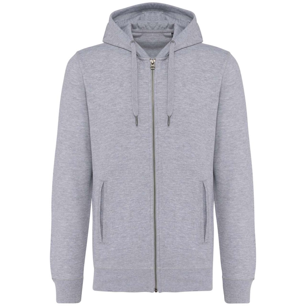 80% bio pamut / 20% újrahasznosított poliészter. Oxford szürke 75% bio pamut / 25% újrahasznosított poliészter. Francia frottír LST (Low Shrinkage Terry). Szövet: enzimes mosás. Karcsúsított szabás. 2 csíkos elülső zseb. Fém cipzár. Bordázott kézelő, bordázott szegély és bélelt kapucni. Fémvégű húzózsinórral. Félhold alakú kivitel a nyakkivágásnál, hogy megkönnyítse a díszítéshez való hozzáférést belülről. Twill szalaggal erősített nyak. Nincs márkacímke a nyakon, csak méretcímke a dekorációhoz való könnyebb hozzáférés érdekében. OEKO-TEX N CQ1007/7 STANDARD 100 tanúsítvánnyal rendelkezik. IFTH. Emblémázás: Hímzés, Szitanyomás