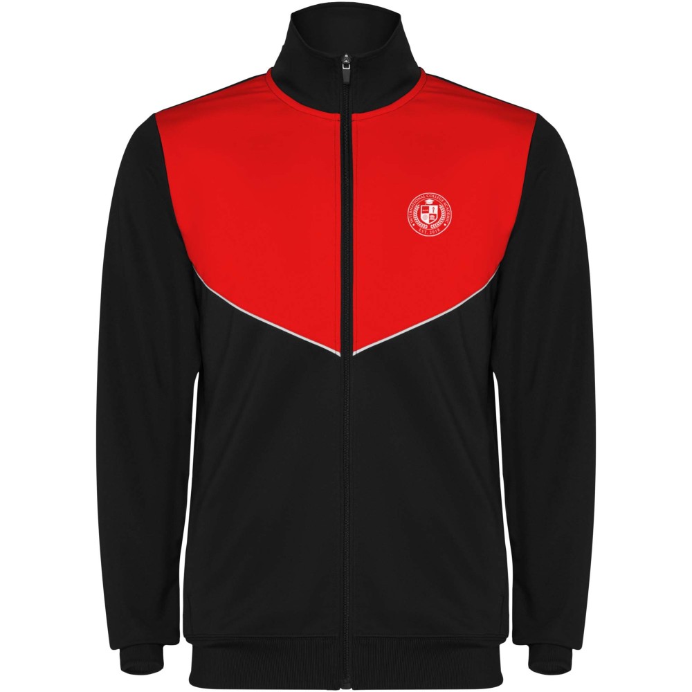 Könnyű és rugalmas anyagból készült melegítő. A végig cipzáros felső kontrasztos színű és varrású díszítésekkel dekorált a mellrészen. Oldalzsebek. Bordázott ujj- és és derékpasszé. Nadrág gumis derékkal és húzózsinórral, kontrasztos oldalsó varrással. Cipzáras szegély. Emblémázás: Hímzés, Szitanyomás
