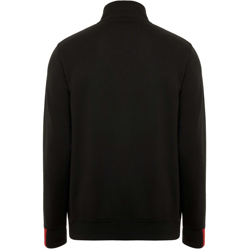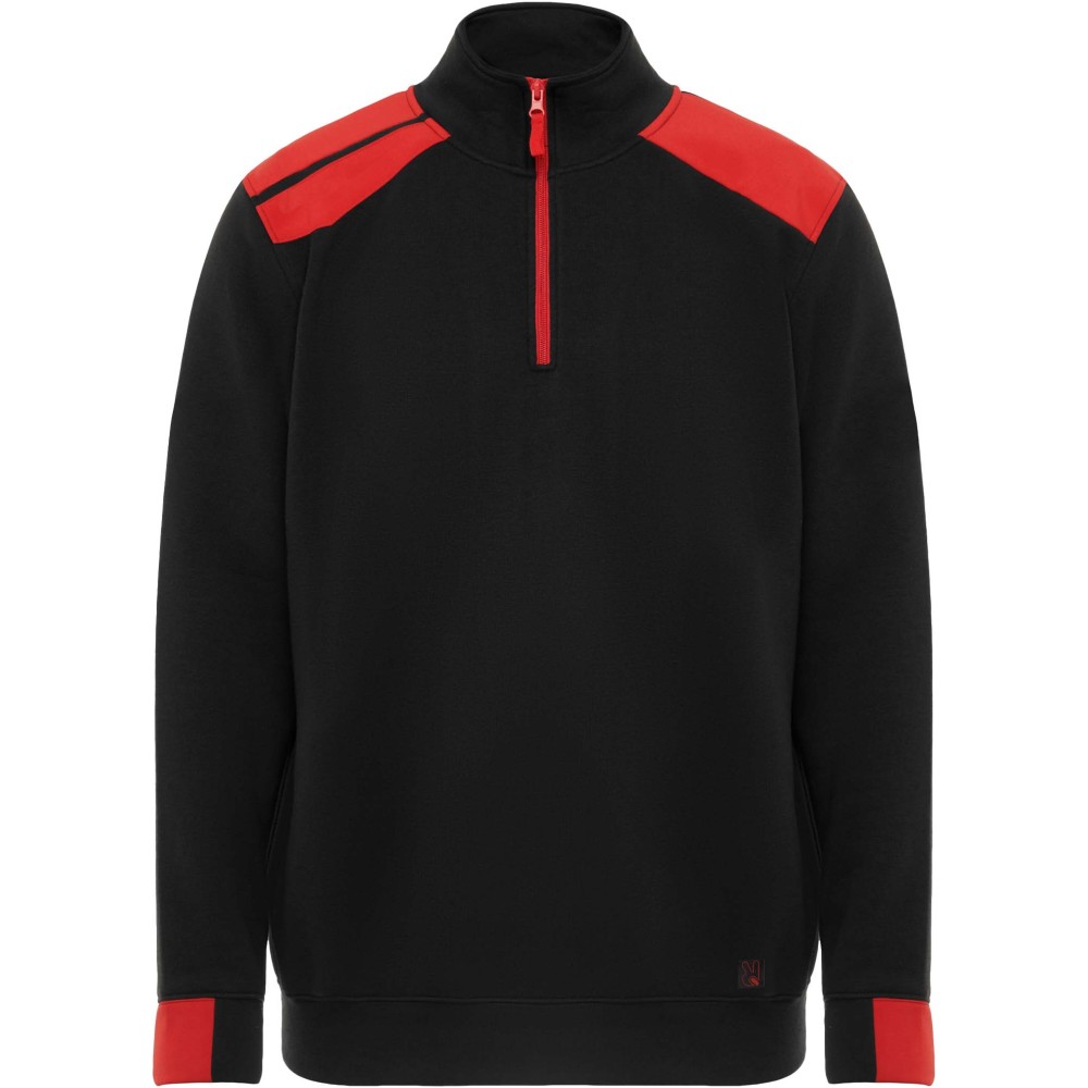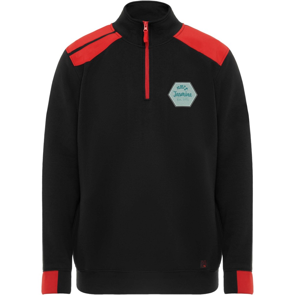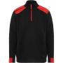 Magas gallérral ellátott, félhosszú cipzáras pulóver. A belső nyakrészen megerősített, fedett varrásokkal készült a tartósság érdekében. A vállrészen és az egyéb részleteken kontrasztos színek találhatók, az ujjak vége és a derékrész pedig 1x1 bordás kötésű passzéval van ellátva.