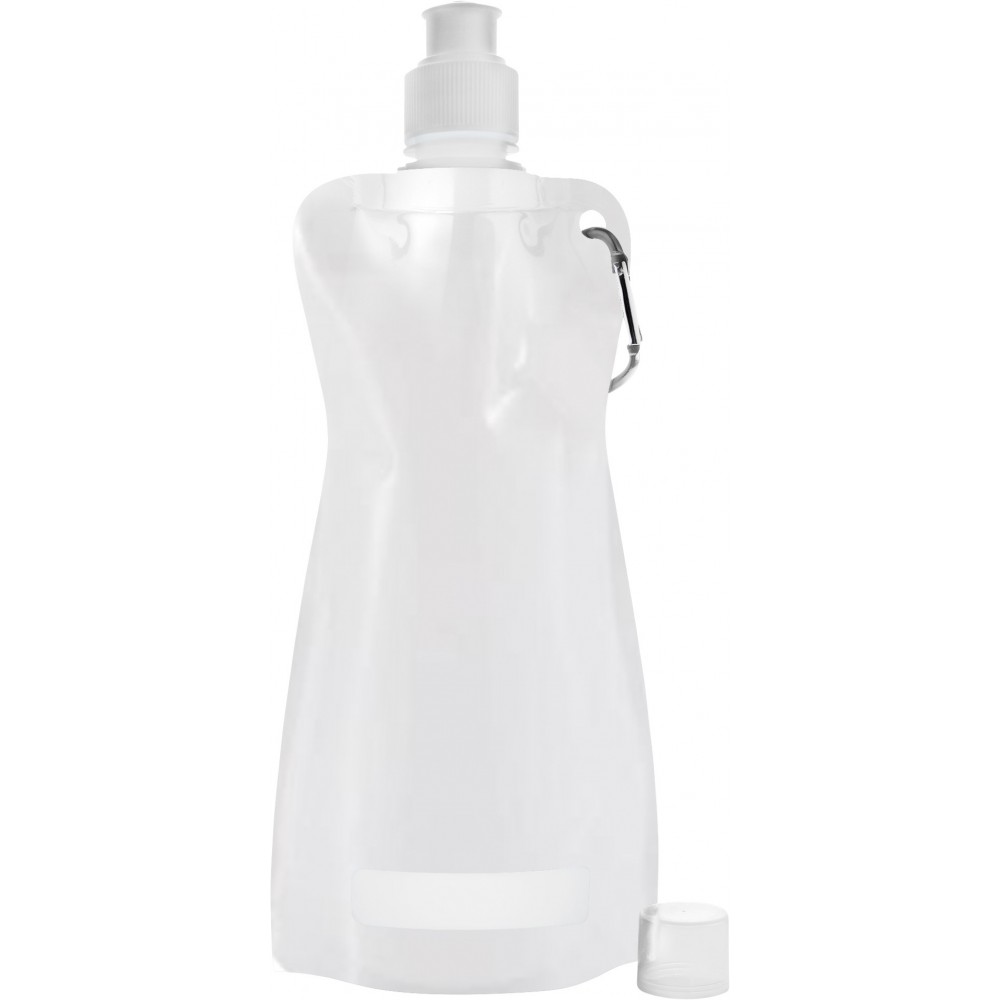 Összehajtható vizeskulacs karabinerrel. Nem szivárgásmentes. Mosogatógépben nem tisztítható. 420ml. BPA-mentes műanyag. Emblémázás: Tamponnyomás