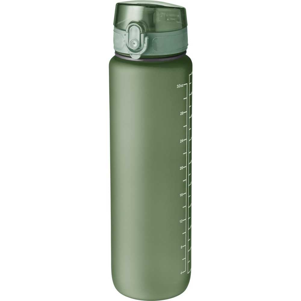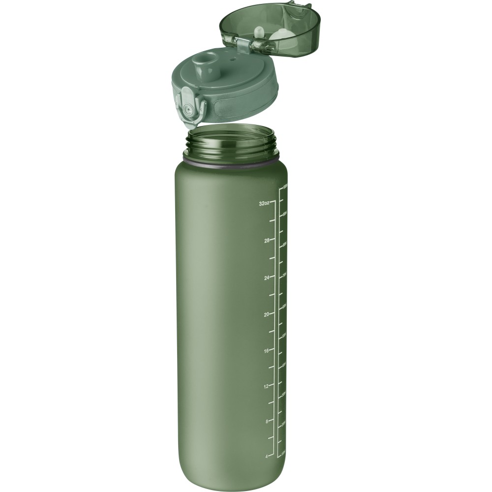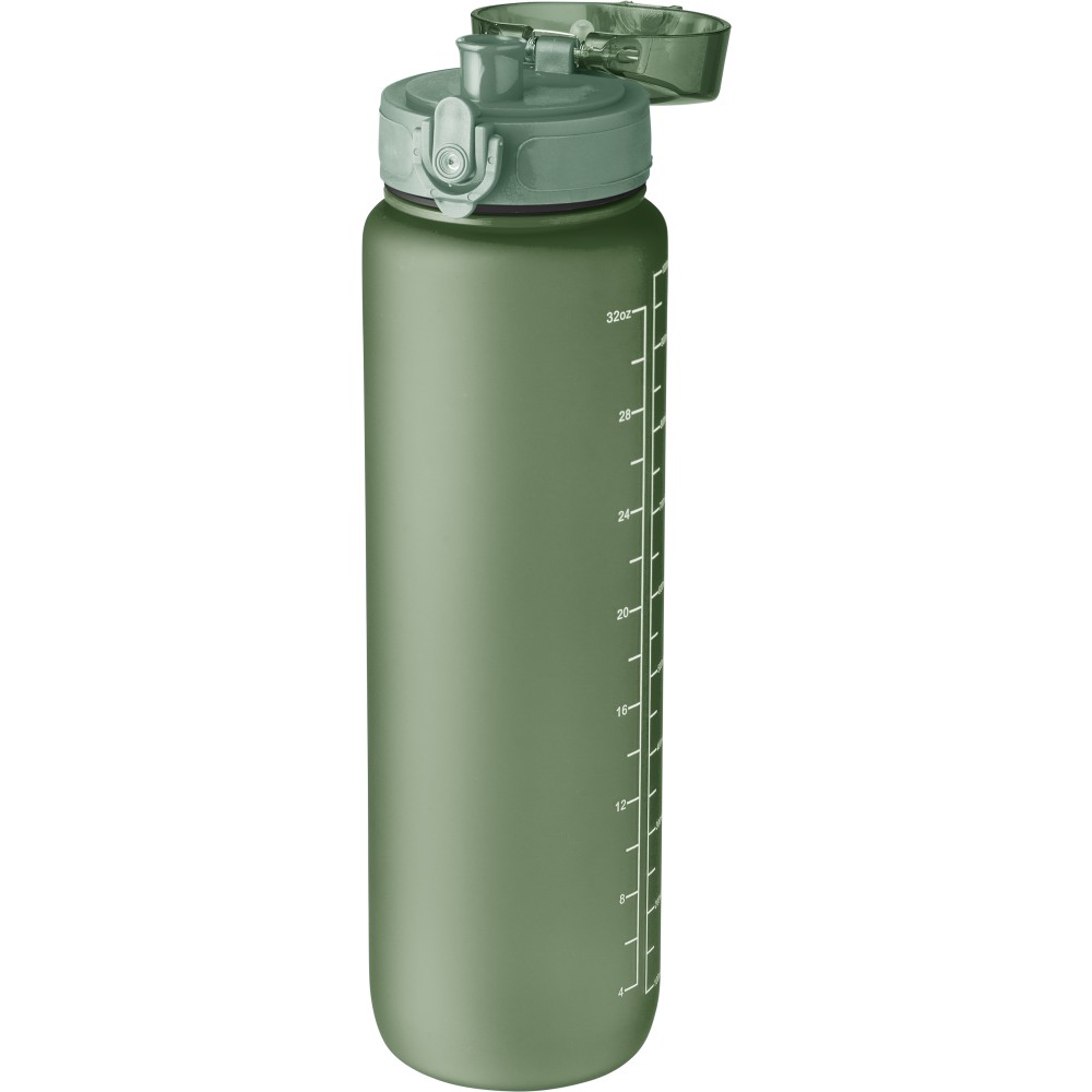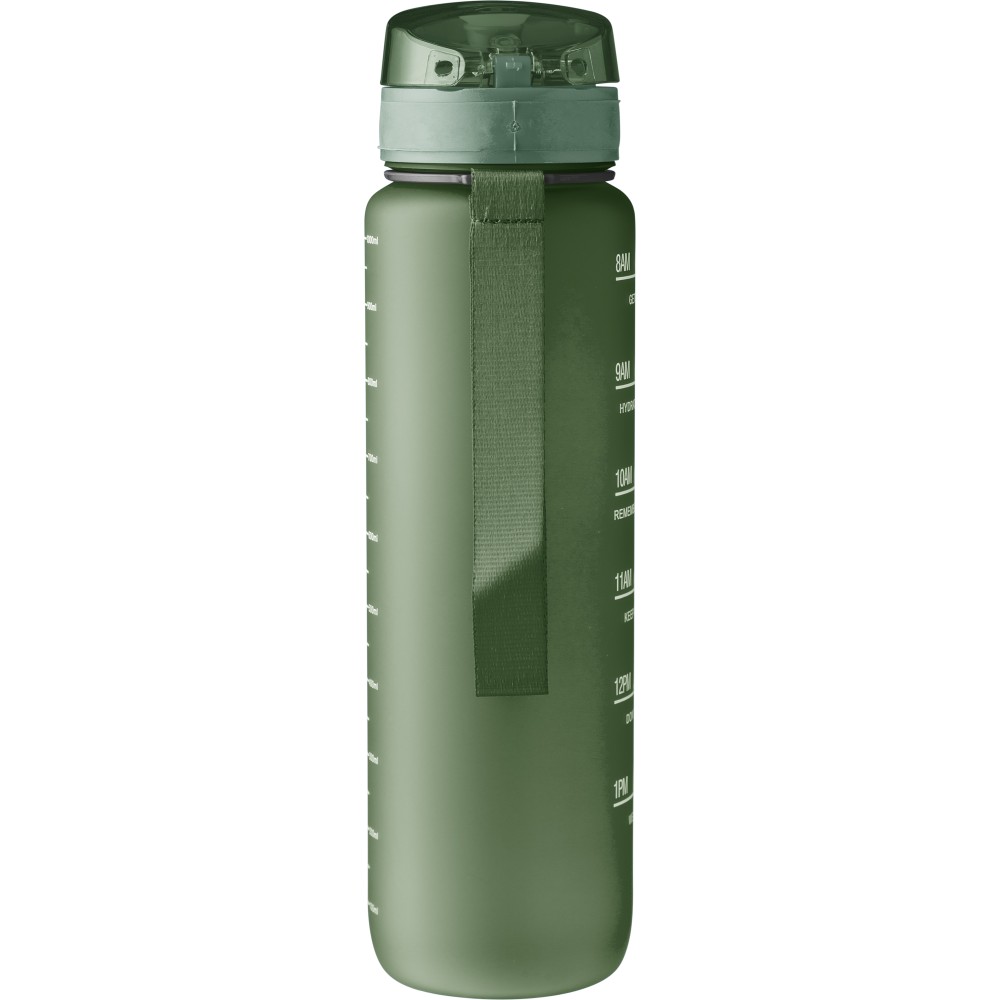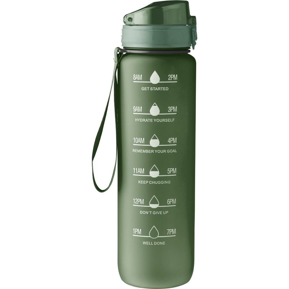 Műanyag motivációs palack szivárgásmentes kupakkal, csuklópánttal, matt bevonattal. Oldalán beosztással. Űrtartalom: 1 liter. Emblémázás: Tamponnyomás, UV nyomtatás