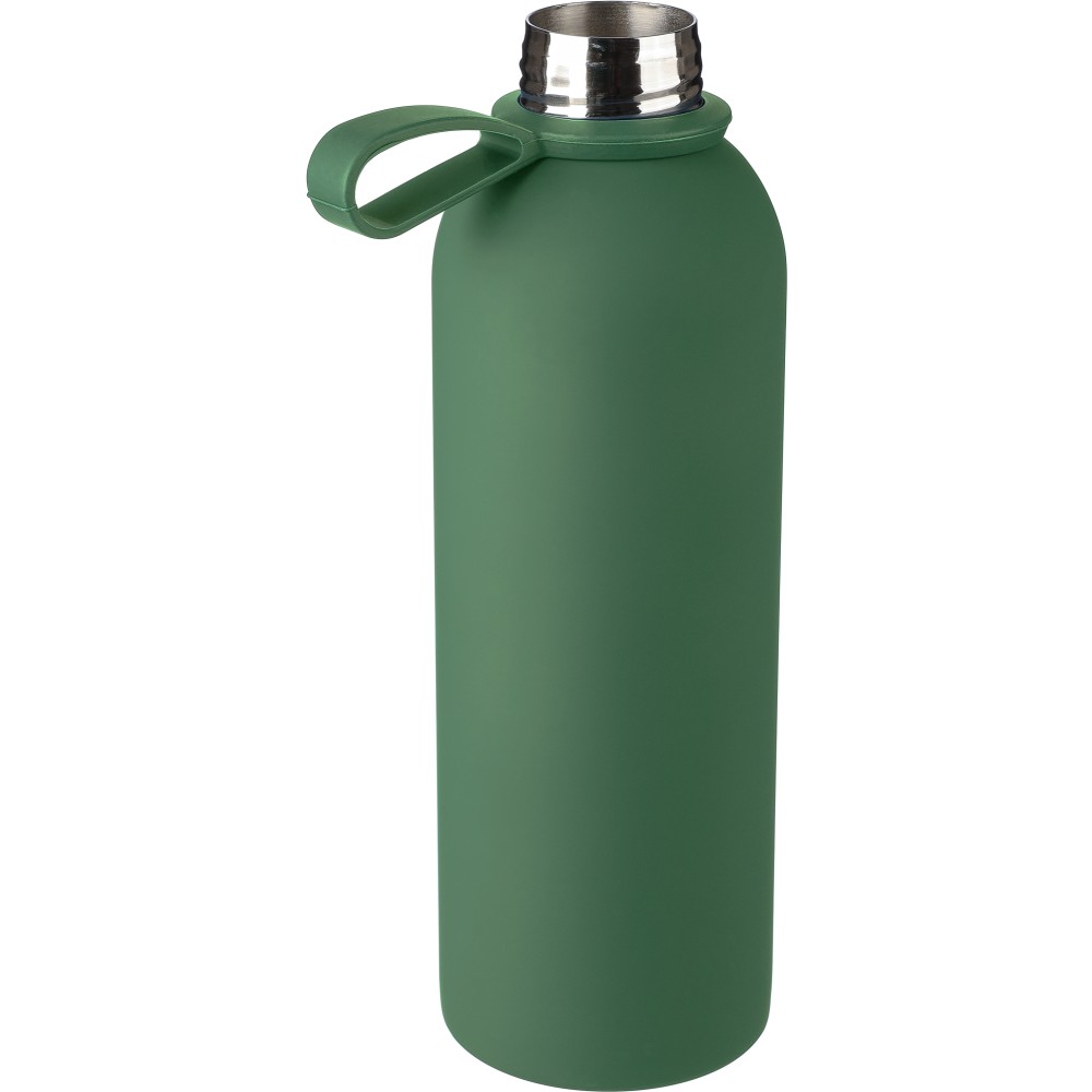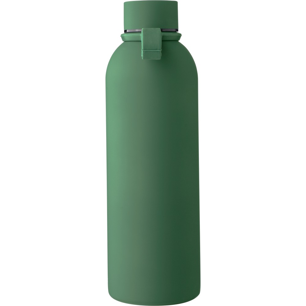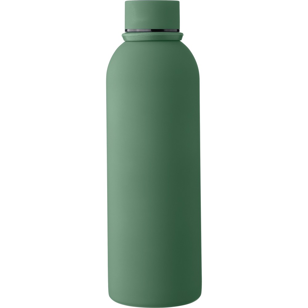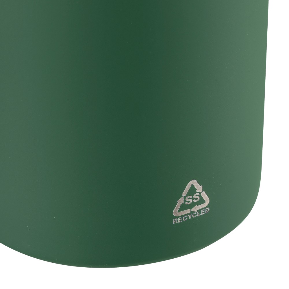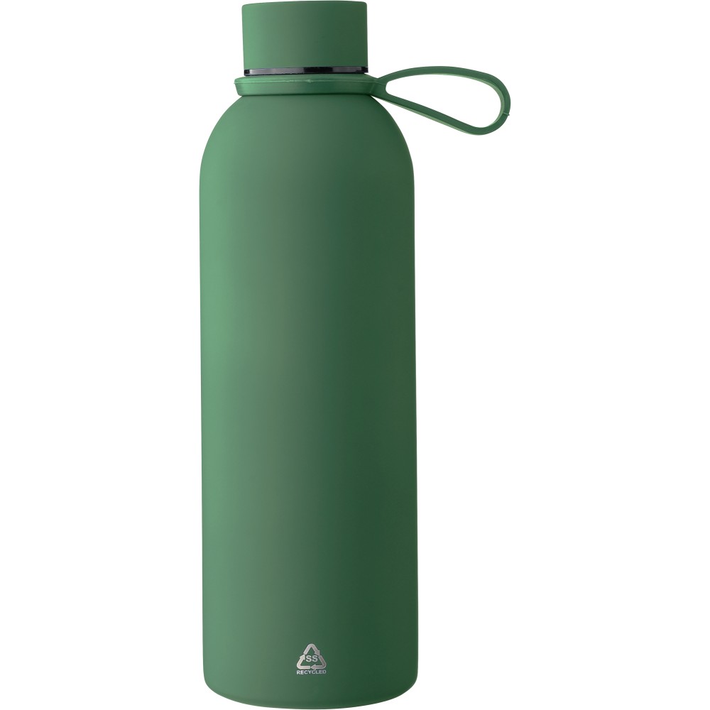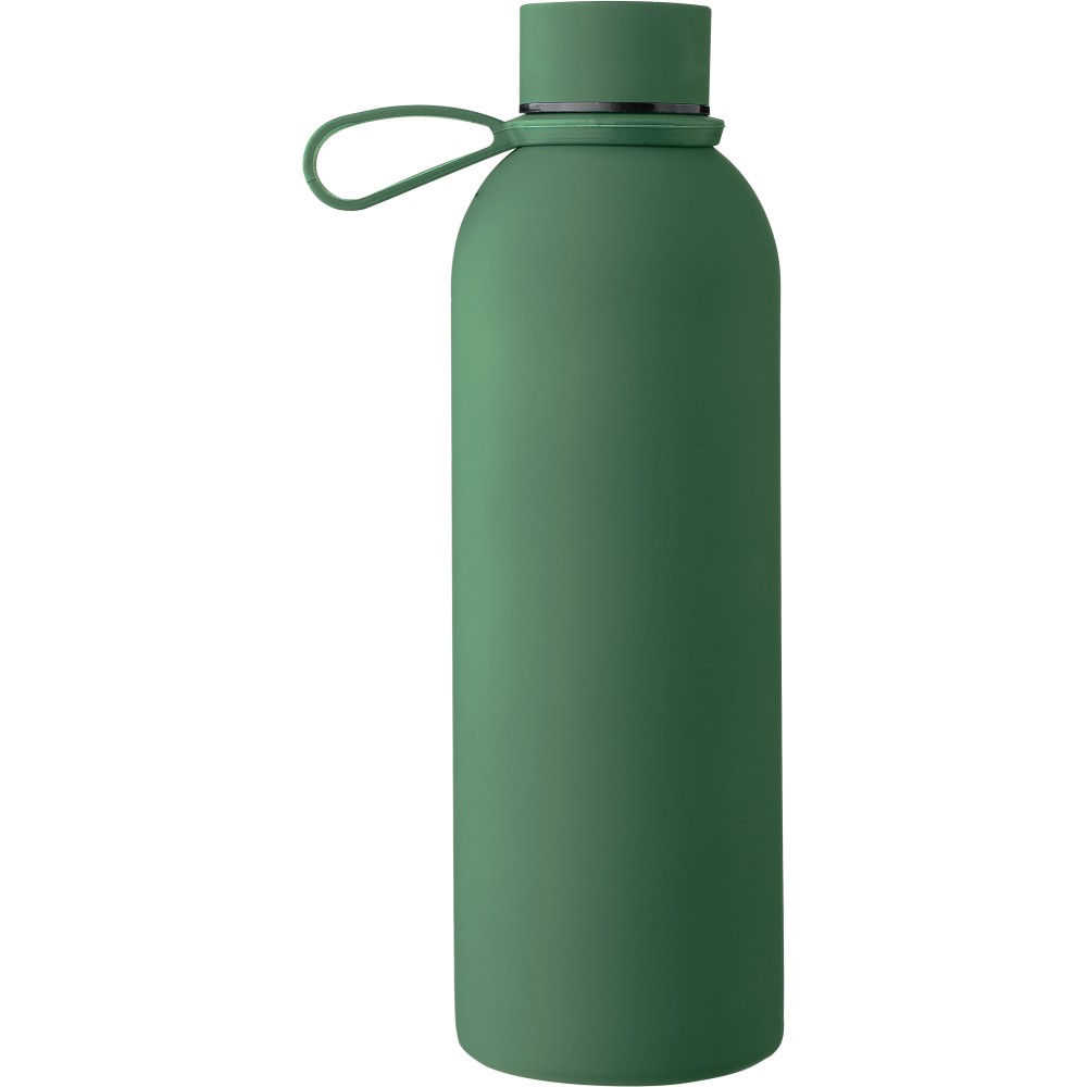 Újrahasznosított rozsdamentes acélból készült duplafalú vákuumpalack, 500 ml-es. 304-es rozsdamentes acél belsővel és 201-es rozsdamentes acél külsővel. Gumírozott felülettel, fém díszítésű csavaros PP kupakkal és szilikon hordfüllel. Gravírozott, újrahasznosított logóval. Csomagolása barna papírdoboz. Emblémázás: Gravírozás