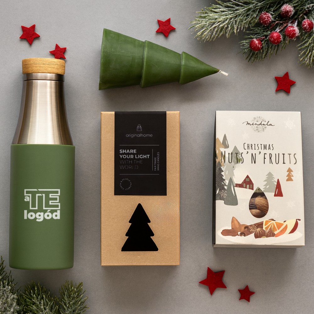 A természet szerelmeseinek szóló összeállítás, amely egy téli sétához vagy kiránduláshoz nyújt tökéletes támogatást. A csomag tartalma: Xmas mag- és szárítottgyümölcs mix, 120g (nan), illatmentes, fenyőfa alakú gyertya az Originalhome-tól, 100%-ban természetes és tanúsított pálmamagviaszból (12632562), réz-vákuumos palack, 540 ml (10066762). Csomagolási lehetőségekről érdeklődj ügyfélmenedzserednél! A kép illusztráció. A kínálatunkban szereplő termékek igény szerint kombinálhatók. A csomagot rendelés esetén állítjuk össze. Várható szállítási határidő: kb. 2 hét. A termékek emblémázását és csomagolását nem tartalmazza a csomag ára. A csomagban szereplő élelmiszer csak csomag részeként rendelhető. Csomagoló anyagok Emblémázás: Gravírozás, Matricázás