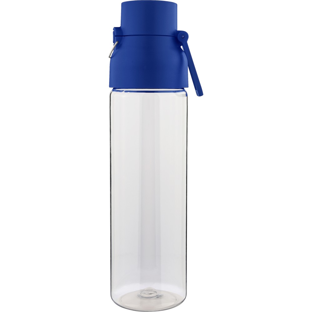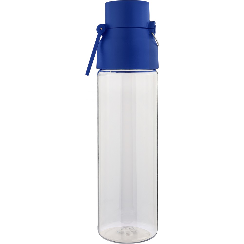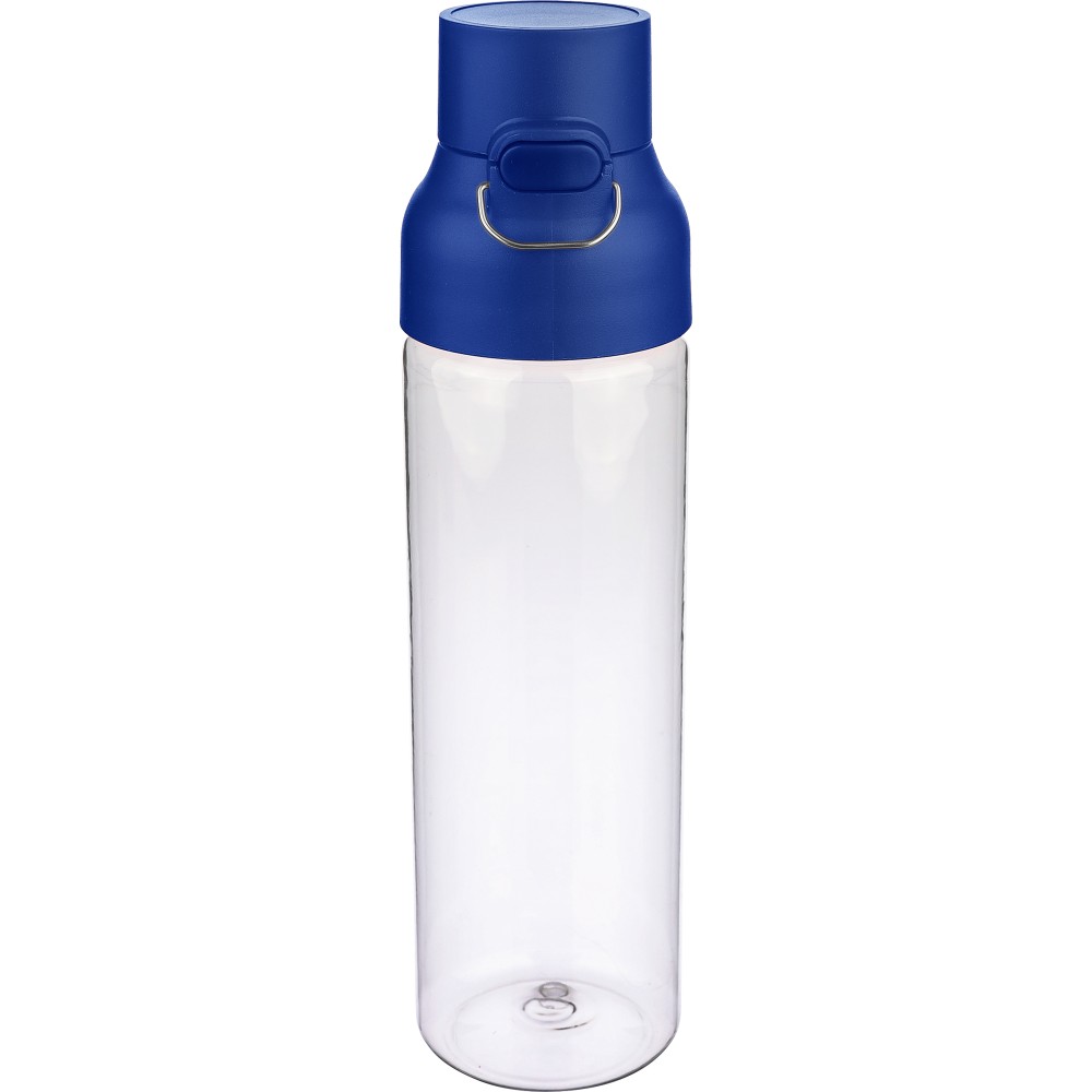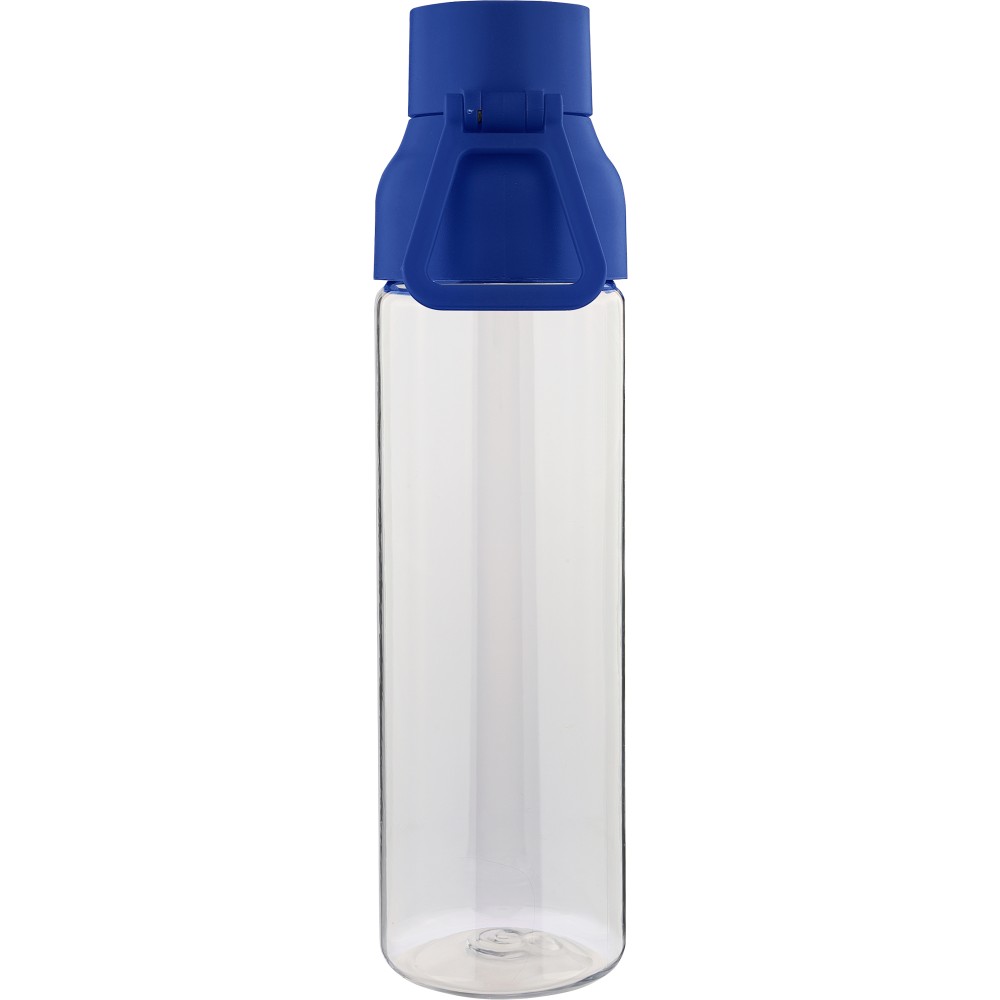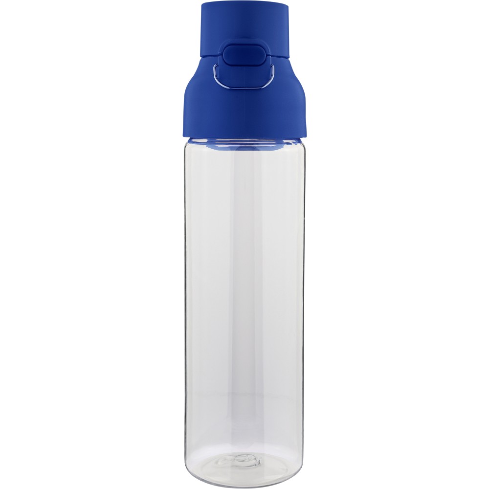 Tritán vizespalack 750 ml-es űrtartalommal, átlátszó palacktesttel és színes kupakkal. Tartós és könnyű anyagokból (PP) készült, amelyek ellenállnak a nedvességnek, a vegyszereknek és a mindennapi igénybevételnek. Mindennapi használatra tervezve; biztonságos nyomógombos zárral és felső hordozófogantyúval rendelkezik. Alkalmas munkához, iskolához vagy szabadtéri tevékenységekhez.